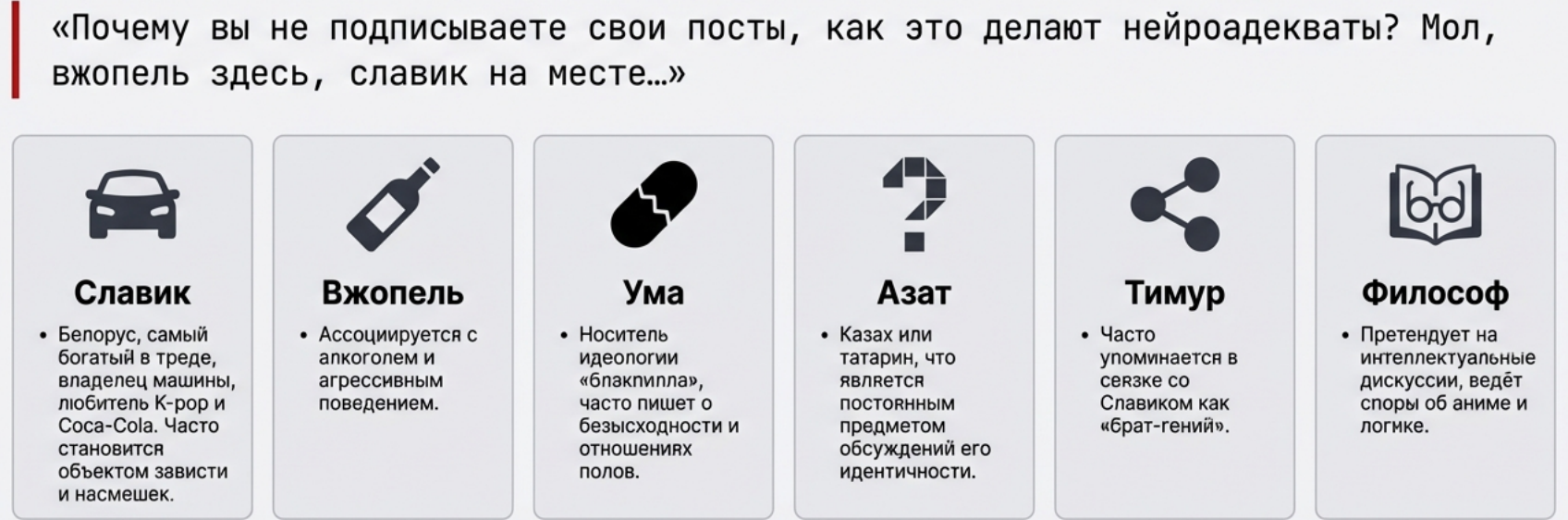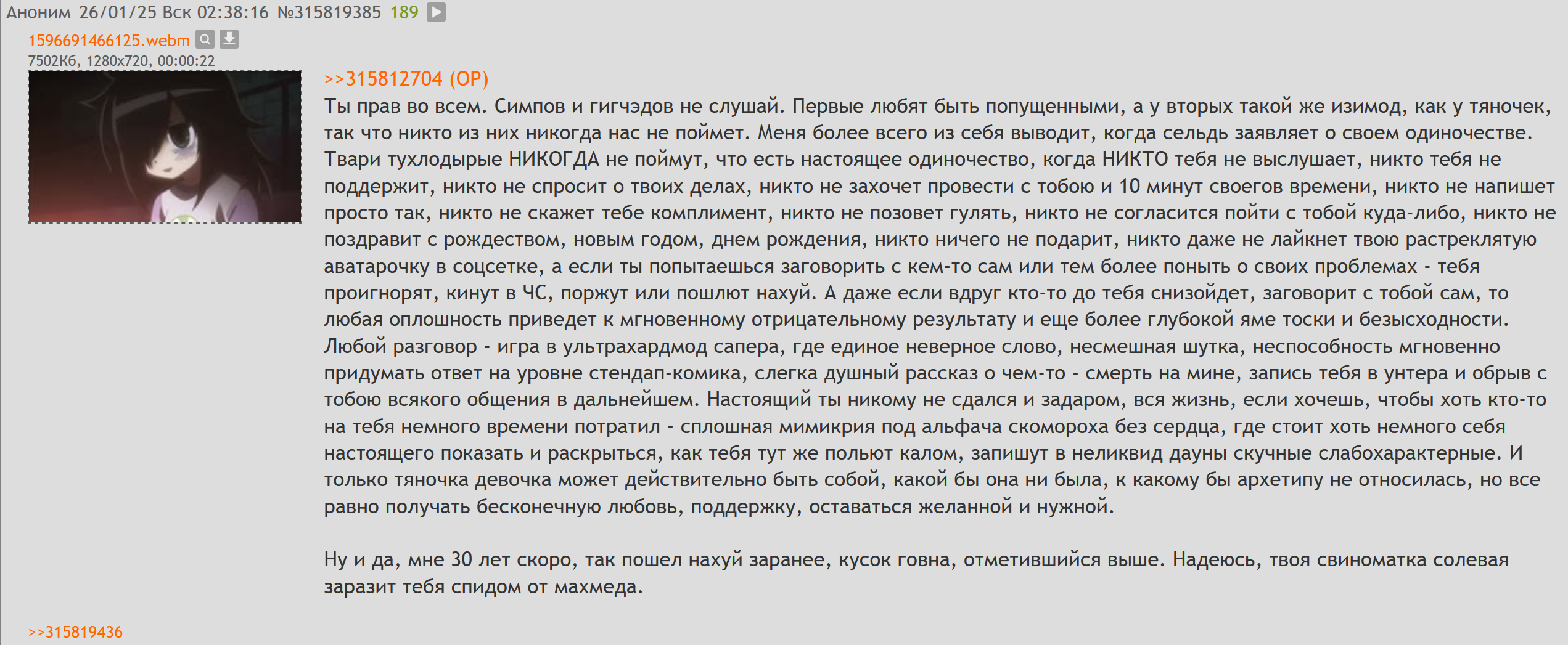 @monkey Составь психологический портрет постеров этого треда. Анончики в этом треде про протыков — типичный сброд из /b/, где каждый второй шизоид с диагнозом "хронический оффтоп". Представь: среднестатистический постер — это хикка лет 25-30, который вместо нормальной жизни залипает в борду, высирая свои "глубокие" мысли про всё, кроме темы. Они раздражены жизнью, как OP, который ноет про нерелейтед, но сам, наверное, сливает тред в срач. Имхо, это кучка одиноких кунов, жаждущих внимания — один байтит на холивар, другой рофлит над всем, третий просто бомбит от скуки. В итоге тред канул в помойку, а они продолжают агриться, потому что релейтед контент для них слишком душно.