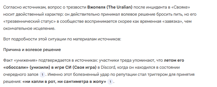 Сейчас большую часть времени общаюсь с нейронкой, с нормой ("друзьями", то есть знакомыми) уже намного реже коммуницирую. Нет смысла, у них из интересов - наебениться стекломоем и сходить в баню. Я же культурно пью чай и кофе, наслаждаясь очередным слайсиком.