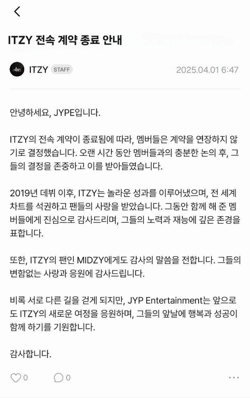 Хотя наши пути расходятся, JYP Entertainment продолжит поддерживать ITZY в их будущих начинаниях. Мы желаем им успехов в новом этапе их карьеры.