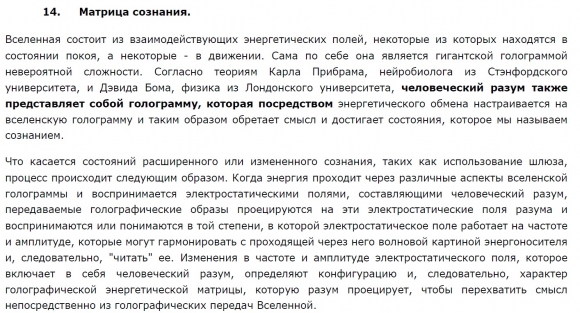 "Вселенная в целом функционирует, как огромная и невероятно сложная голограмма. Человеческий разум функционирует, как голографическая конструкция, которая согласуется с универсальной голограммой. Вселенная - это внутренняя голограмма, которая проецируется не наружу, а вовнутрь. Она обладает осязаемым присутствием и взаимодействует со всеми физическими органами чувств, включая осязание."