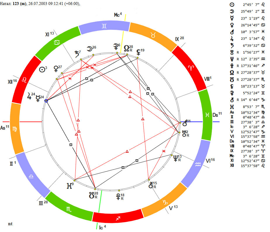 1. Скриншот с натальной картой. Желательно прикрепить таблички с аспектами и градусами планет и домов. Всю хреновину, что программа выдаёт сбоку или внизу карты. 2. 26.07.2003 время 09.12 3. Женский 4. Операции весной 2011, и весной 2013, предложение декабрь 2025 5. Интересуют отношения, а именно сколько браков будет. Так же интересно умру ли я в нищете, и какой уровень дохода будет преследовать меня по жизни, не будет ли просадок существующего дохода. Так же вопрос касательно предрасположенности к магии (мне мама часто говорит, что у меня хорошая интуиция, мне нужно заниматься медитациями, развивать духовное и т.п.) P.S: Уважаемые, посмотрите пожалуйста, буду рада ответу и хорошо отблагодарю в честь наступающих раздников