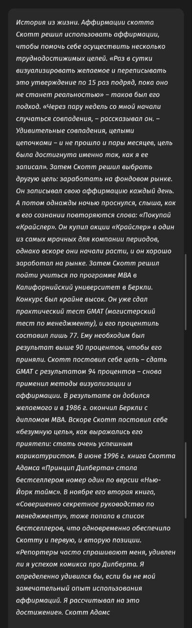 > И как эти деньги, телки, яхты и спорткары придут ко мне? С неба посыпятся? Не должно ебать. Вы не должны задаваться вопросом как это произойдёт. Ведь это уже произошло, если вы в воображении представили что обладаете необходимым, испытали чувства и свыклись с ними. Если вы успешно выполнили манифестацию, матрицу начнёт трясти и корежить, и она всячески будет подсовывать вам недостающие элементы пазла. То есть те самые вещи/события, которые послужили триггером к появлению ваших чувств. Это неизбежно, это закон. Этого не надо ждать. Ведь если вы ждёте, значит еще не до конца осознали что уже это имеете. На своём опыте могу сказать что могут происходить абсолютно шизофренические цепочки случайных событий, о которых вы даже помыслить не могли, и в моменте еще не осознаете что именно они являются путем для проявление вашей манифестации.