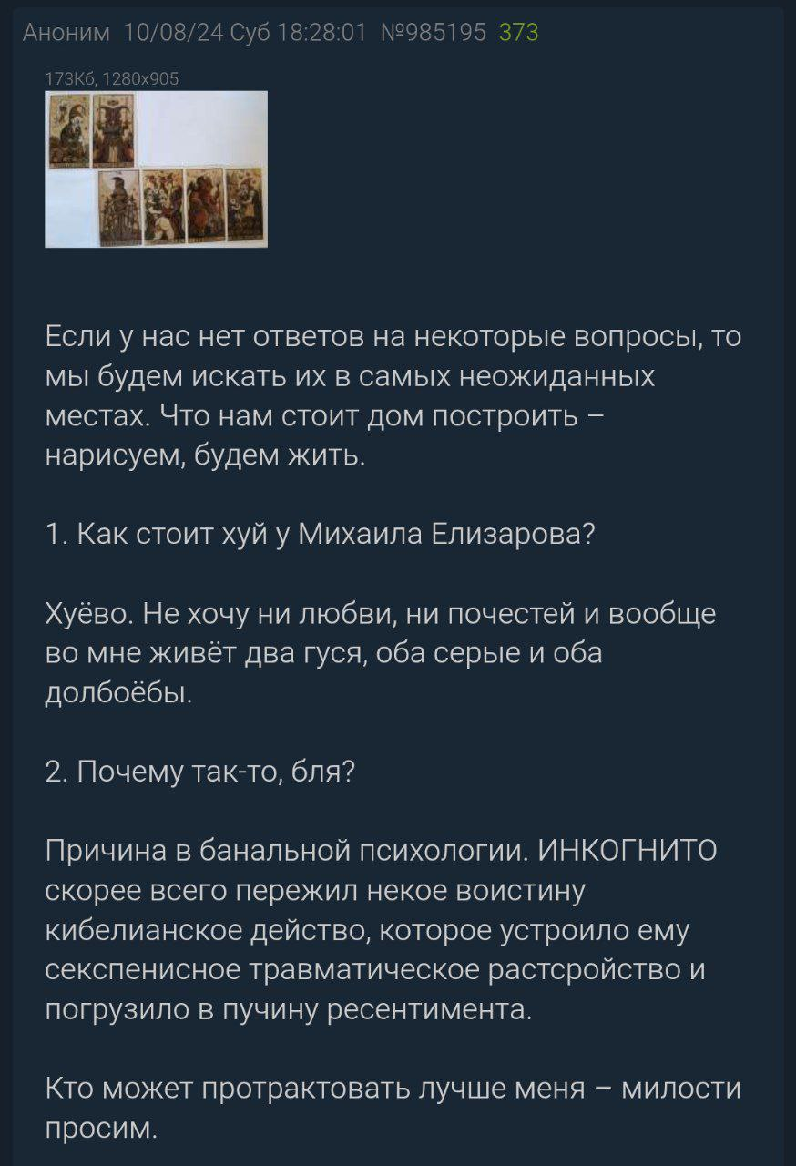 не стала бы я слушать мишку в вопросах практической магии. я уверена на стопицот процентов, что он много-много лет пытается промышлять, в т.ч. вдохновляясь потугами некоторых своих готичный баб и хриммуарами всяких головиных, но выхлоп в общем и целом -- по пизде ладошкой. вполне даже возможно, что товарищ в деде этом свой путь описывал, только совсем уж вычурно и иронично. что я по факту вижу у аффтара на текущий момент? 1) муладхара просажена просто нахуй, стоит как пустая свеча. лунарен и откровенно слаб. не могу сказать насколько прям раньше было лучше, но однозначно было. баланс витальной энергии жестко проёбан. 2) анахата у него что для исполнителя, что для практика говно. она как иссохшееся яблоко на батарее -- излучает только слабый пожилой аромат. 3)наш милый друг совершенно не умеет снимать с себя привороты и их последствия от бабищ из рюмки. куда ни копай -- одни блоки на семятоки и во снах нябось мучаеццо с ватагой искаженный пиздобразов. чуть ли не главная причина того, чому он всаженный такой. 4) аутичный разум и отсутствие нормальной самокритики -- штуки, которые не шибко позволяют учиться отделять зёрна от плевел. путаются "правда" и "интересно", а в ошибках будет виноват весь мир, вплоть до последней ебунявой псины за окном. по подобным причинам и учить его тоже достаточно бесполезно. 5) подробности я опущу, ибо мы не на фагаче, но с абсолютной уверенностью заявляю, что ворожить баб сам он решительно не способен, а доводить обидчиков горазд скорее консервативными методами. тза сим могу сказать, что в юдоли и прочих произведениях годнота по магическому делу окажется либо затесавшись случайно, либо уж извините, но в руках талантливого человека и сборник арманских анекдотов -- самоучитель по фаерболам.