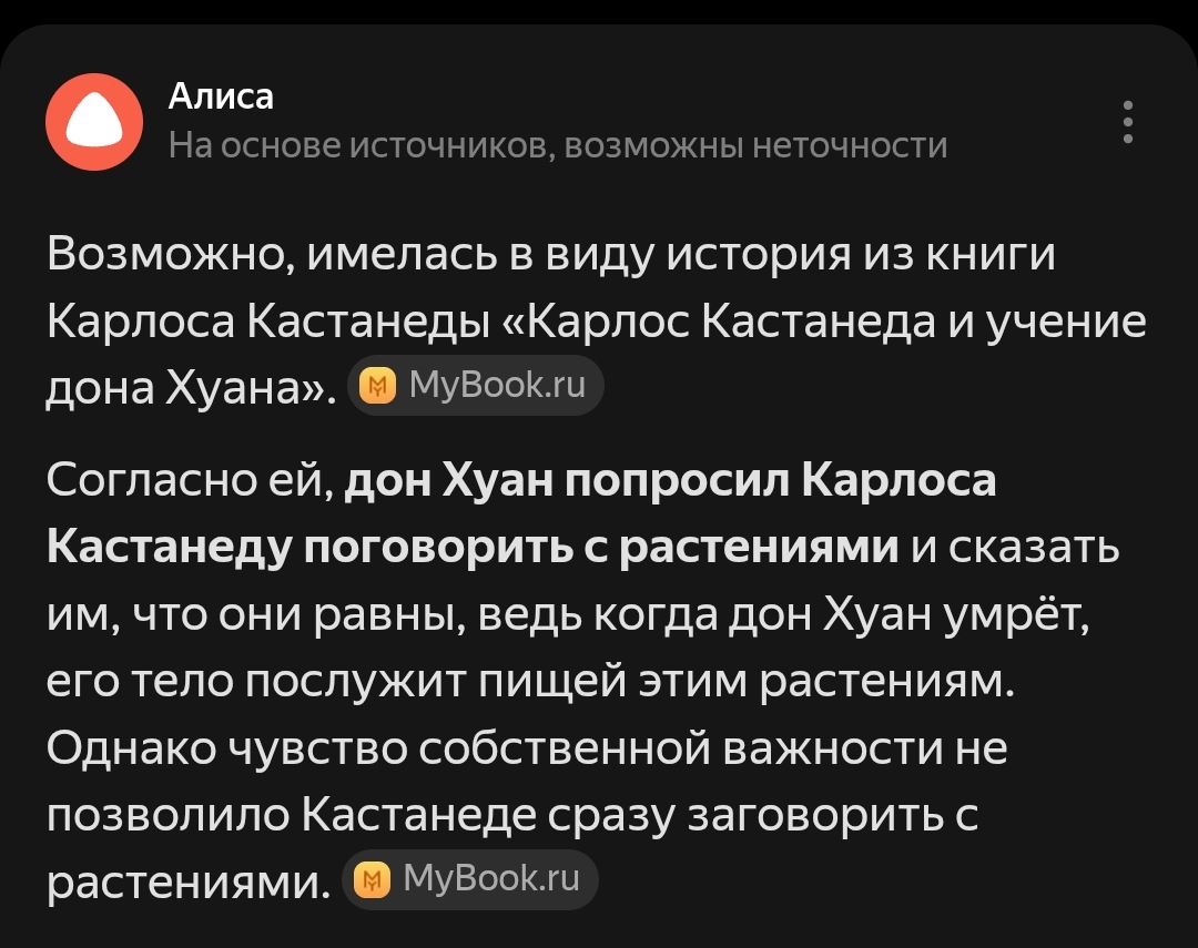 >>692589 Нашёл. Бессмысленно односторонне разговаривают без ответа от растений. А я знаю духов растений и могу с ними разговаривать. Не знаю в чём причина, чё Дон Хуан так не может. Духи растений вполне разумны. Зачем говорить с самими растениями непонятно.