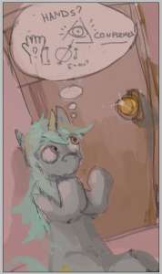 Не удержавшись, ты запускаешь пальцы за ушко. Как горячо и мягко... Лира соскакивает со стула, и смотрит на тебя - внезапно покрасневшая и с растрёпанной гривой. - Эй, Анон, у нас так не принято... Ты недоумеваешь. - Ну да, конечно. - Лира приглаживает непослушные волосы. - Откуда б тебе знать. У нас, у пони, это весьма чувствительное место. - Извини. Лира смотрит на тебя и молчит. - Ох, ладно, - решается она. - На самом деле не чувствительное. Интимное. - Она опять краснеет, и это выглядит довольно странно с её цветом шёрстки. - Но лучше уж я тебе это расскажу, чем на балу в Кантерлоте ты схватишь своими неуклюжими лапами ушко принцессы. На луне в это время года прохладно, знаешь ли. - Спасибо за предупреждение, Лира, - говоришь ты. - Надеюсь, ты не планируешь отправить меня на луну? - Нет, только за стол. Суп стынет, - улыбается пони. - Просто мы не так давно знакомы, и это было немного... неожиданно.