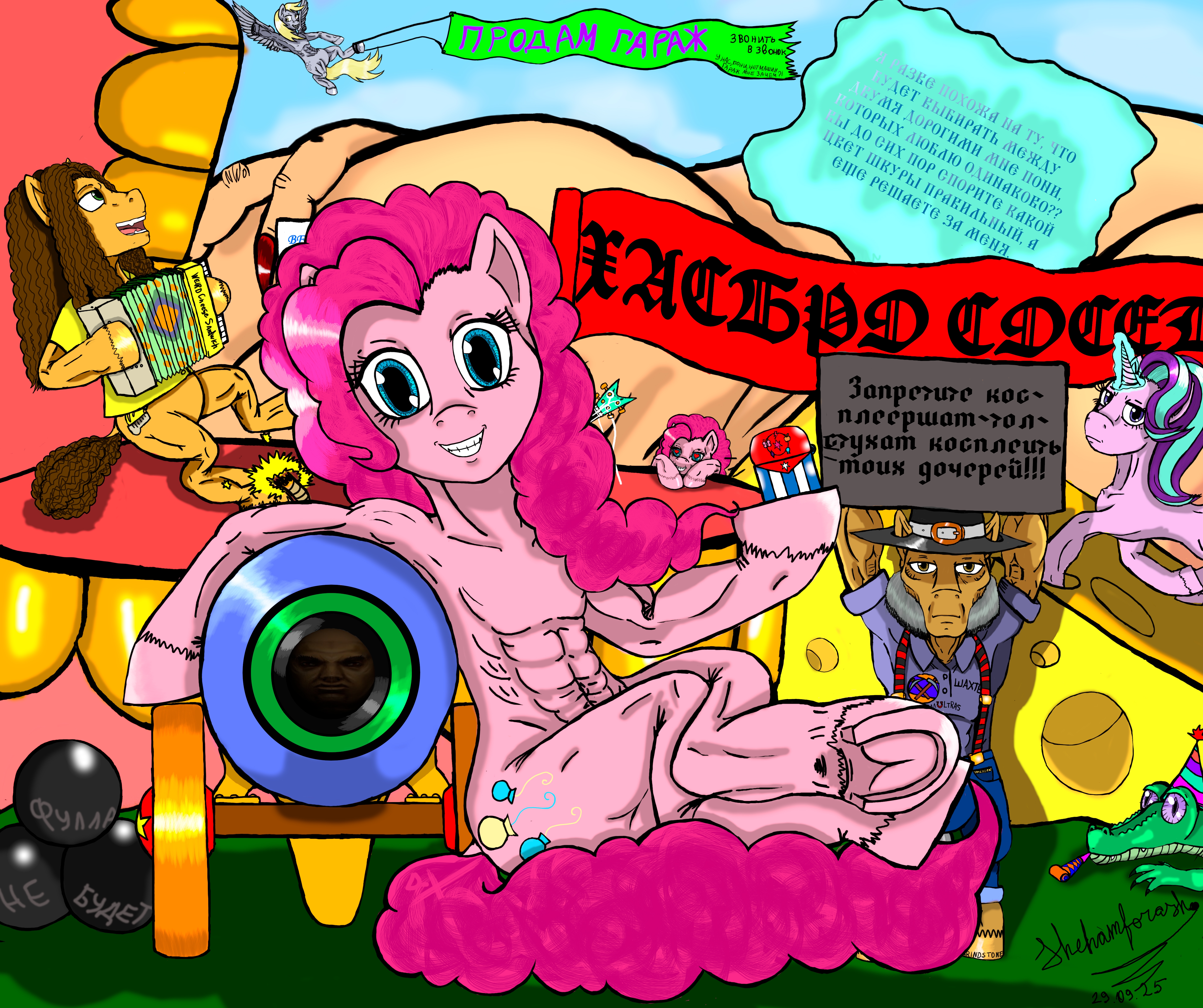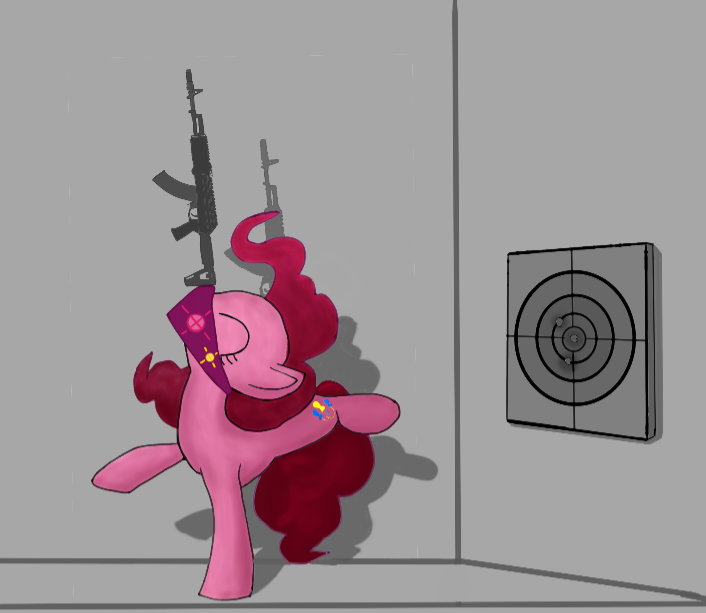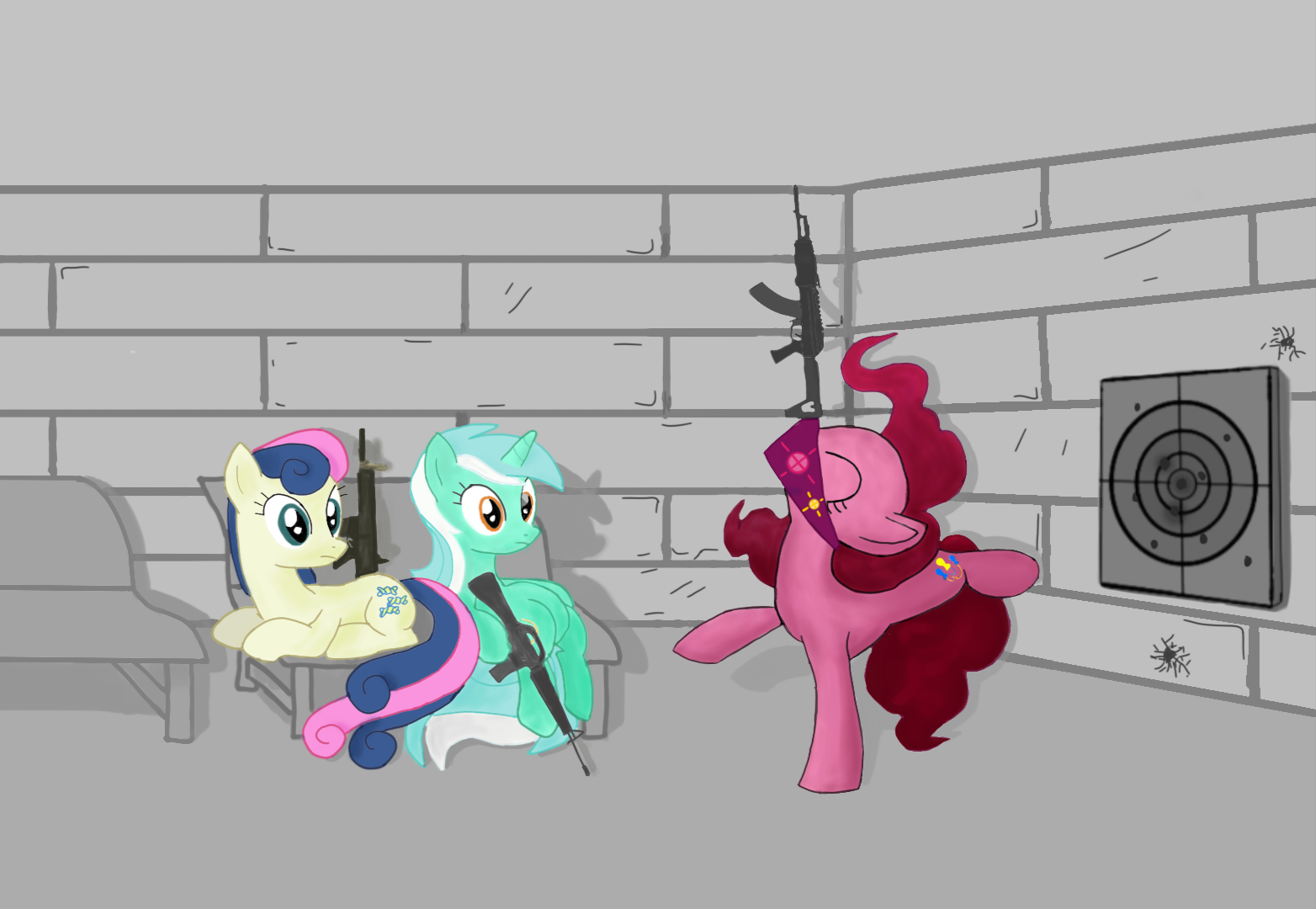 Дополнил свою поняшную пикчу деталями, из скучных стен сделал что-то наподобие кирпичных стен, добавил Лиру и Бонбошку, которые видимо, не ожидали от Пинки Пай попадания в центр мишени с расстояния 20 метров. И да...Пони не стреляют патронами, они стреляют магией, ибо стрельба в МЛП-не канон, поэтому гильз нет )