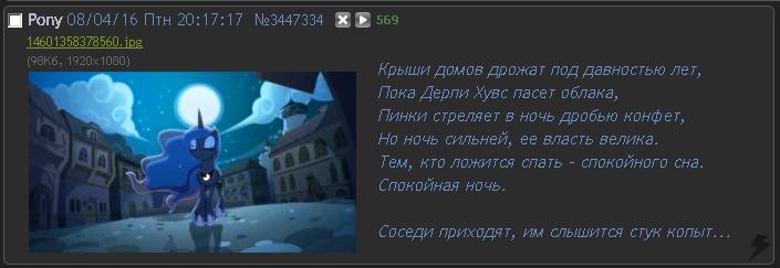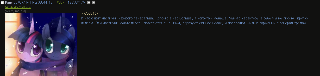 Заходите, не стесняйтесь, Каждый стул берёт себе. У компов располагайтесь, Открывайте /mlp. Раз уж в генерал попались, Вам помочь чуть-чуть хочу: Проводить постов анализ Я вас, дети, научу.