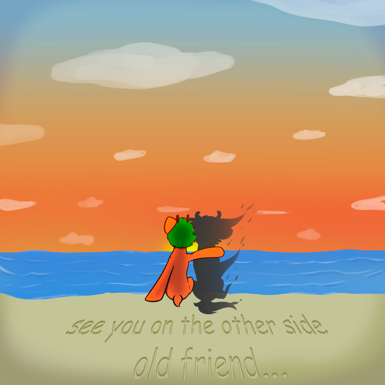 >реквест Нарисуй двух пони на берегу моря. Спиной к зрителю, один, цветной и живой, обнимает другого за плечо, но тот второй - просто тень, черный контур на фоне волн и неба.