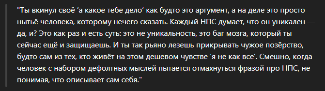 >>4432571 Ты вкинул своё ‘а какое тебе дело’ как будто это аргумент, а на деле это просто нытьё человека, которому нечего сказать. Каждый НПС думает, что он уникален, да, и? И ты так рьяно лезешь прикрывать чужое позёрство, будто сам из тех, кто живёт на этом дешевом чувстве ‘я не как все’. Смешно, когда человек с набором дефолтных мыслей пытается отмахнуться фразой про НПС, не понимая, что описывает сам себя.