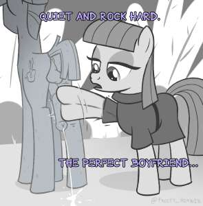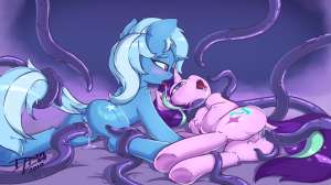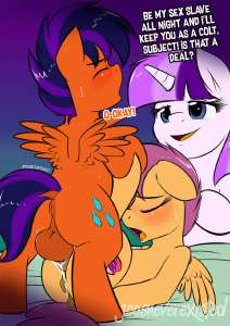 А вообще вместо М6 лучше бы для разноообразия взяли например сюжетных временных или постоянных злючек. Кризалис, Кози Глоу, Темпест Шадоу, Гильда... (Найтмар Мун или Старлайт Глиммер это слишком просто и неинтересно) Та же Кризалис может выебать во все дырки не хуже жеребца, если попросить или сама захочет.