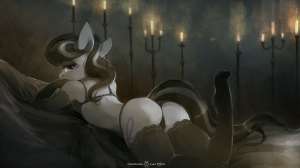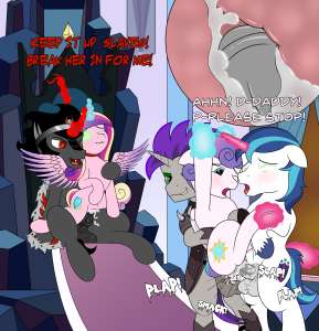 King Sombra licked at Cadance's helpless swan like neck as she tried to jerk away from him. Her husband watched as her naked body squirmed in the tight red rope harness. She pleaded Sombra to stop squeezing her supple breasts. But there was something hypnotizing about his embrace. The aura of terror.. domination… sheer masculinity… soon her pleas just became silence as she bit her lip. Everything was wrong, but she just couldn't resist. She looked over at her helpless husband and mouthed "I'm sorry, shining…"