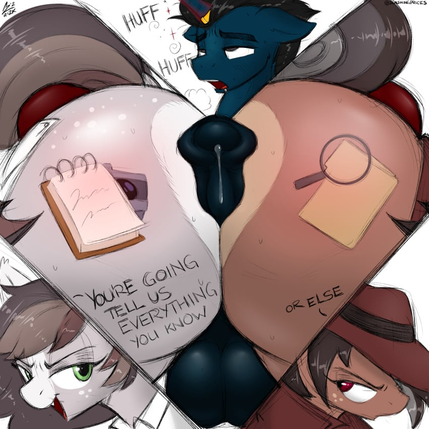 >>4448368 Экви вскрикнула, когда её дёрнули за хвост. Боль пронзила круп, задние копыта оторвались от земли. Холодный воздух обжег кожу под хвостом. Спереди член давил на ноздри. Сзади пристально разглядывали её промежность. Стыд накрыл с головой. - Не надо, - сорвалось шёпотом. Второй бандит провёл чем-то твёрдым по её петле. Холодно и грубо. - Чистенькая, - усмехнулся он. - Никто не трогал? Экви не ответила. Она висела, как тряпка, пытаясь думать о чём-то другом. О тепле камина, о книгах, о Твайлайт. Но реальность возвращалась с каждым прикосновением.