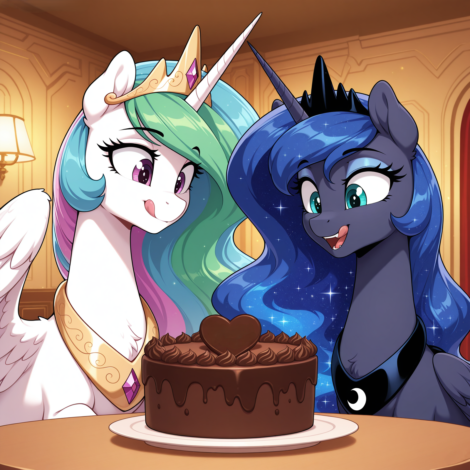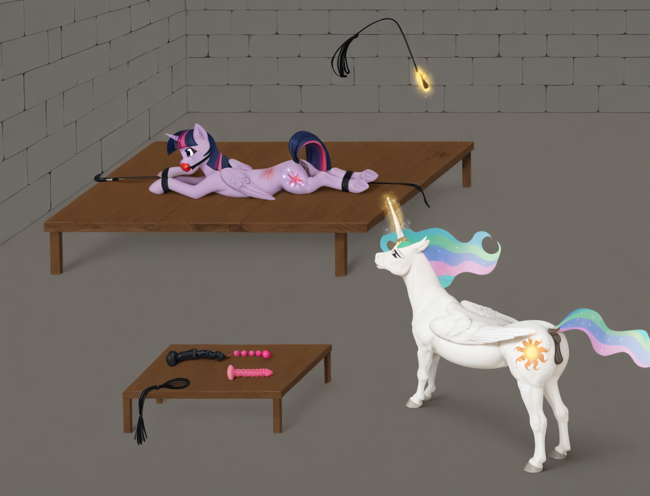 Блин, как же тяжко генерить сцены с более чем одним персонажем. Если делать по наброску то прям сильно все зависит от качества самого наброска, что для криворучко вроде меня проблема. Качество вывода то можно повысить слегка повысив уровень шума, но тогда умный ИИ начинает ломать сцену. Скажем в данном случае ему становится очень важно нацепить кляп на Селестию. Про удаление левитации я вообще молчу. А пытаться описать сцену в промпте при генерации с нуля вообще практически бесполезно.