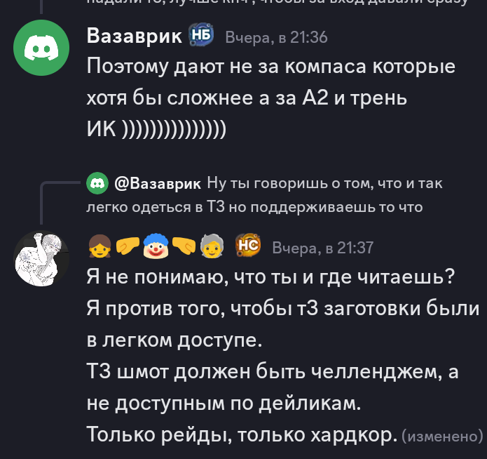 >>6624556 >три сета для ПВП, пве и до Штобля? Я не знаю, как сейчас, но тогда никто не делал разные шмотки для пвп и пве. Максимум – пушки разные у варов и паладинов, остальное-то нахуя? А драконки с рейдов брались, чтобы их получить, одинхуй надо было в гильдии состоять. >30кри за паровоз Какие кристаллы на нитке, ебанулся совсем? С рандомов из чата брали плату, своих всегда бесплатно возили, хоть из основной гильдии, хоть из дочерней. И в астрал возили, и в дальние дз, это же совсем червём-пидором нужно быть, чтобы платно возить своих. >нетупые и сейчас залетают в топ ги и одеваются наравне с топами. А хули толку, если через два месяца всё это по пизде и поехали сначала всё дрочить? Раньше хоть весь сезон одни шмотки носили, только улучшали и камни ставили.