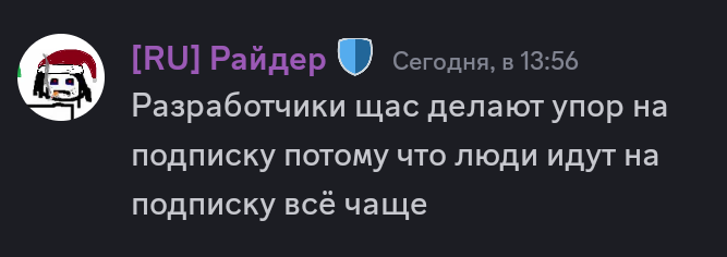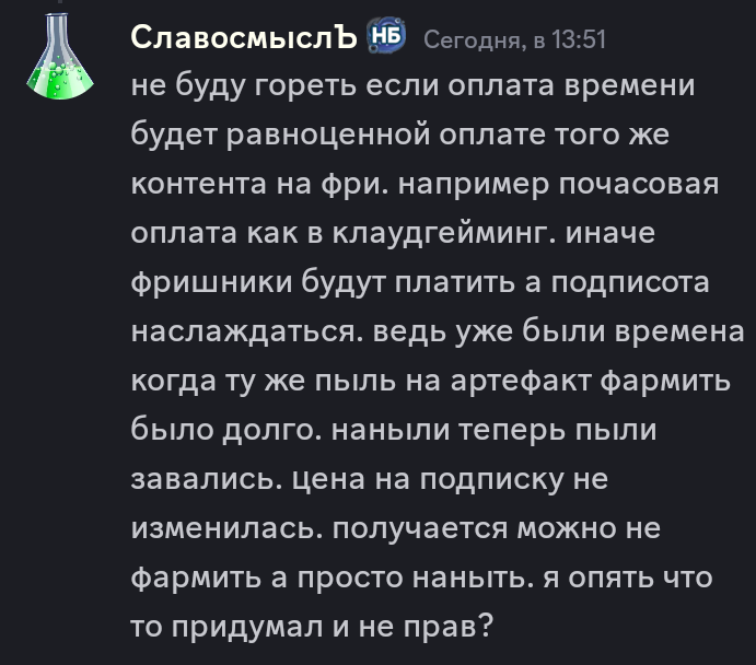 >>6626616 В игре как раз анальный донат были при Нивале. Когда Мыло игру себе взяло - стало значительно легче. Вон, подпиську ввели. Хотя специфика у неё своя имеется. Нельзя однозначно сказать, где тебе будет лучше. Кто-то радуется на фришке, вкладывая шальную тыщёнку с зп под лампу, кто-то платит подпиську. Тут уж сам решай.