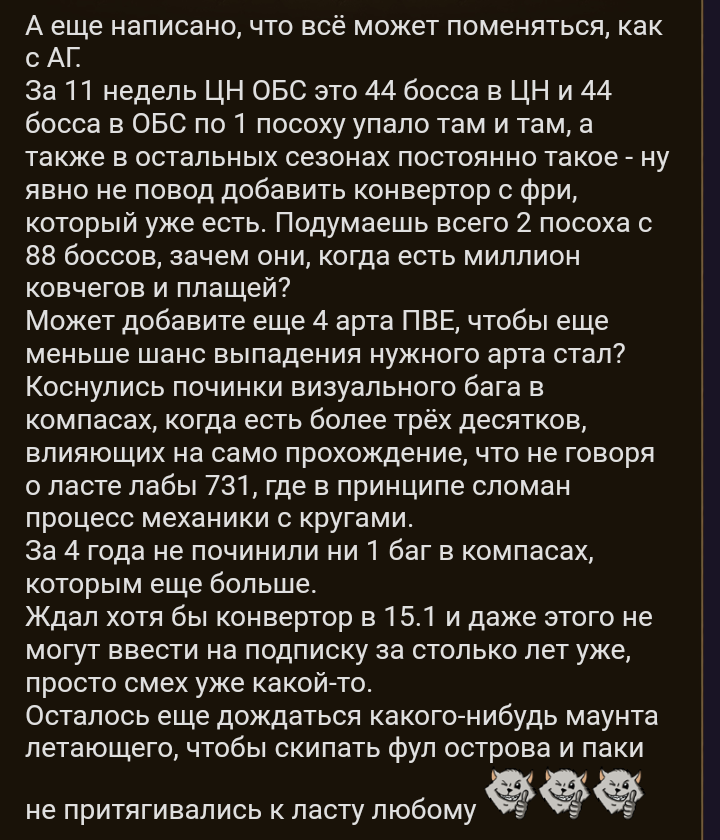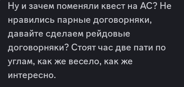 Смотрю новый слой, думаю дай зайду поиграю, с 15.0 зашёл один раз только сюжетку пробежать. Решил сходить в астрал, ну думаю контент простенький, что может пойти не так. Купил три шмотки с аука и вперёд в автосбор, раньше всегда так делал. Кстати в астрале почему-то теперь интерфейс пати сменился на рейдовый, дрищев как всегда сломал то что всегда работало. Закидывает в пять человек, двое из каких-то топ гильдий с нитки, один зачем-то регнул хилом и льётся в дд. Как бы проходить в пять дд несложно но для этого надо хотя бы немного дамажить. Надо бы взять танка, логично что это делать должен самый одетый (явно не я), пишу в чат типо пчелы танка возьмите. Взяли, идём к боссу, челики начинают умирать, хила то нет как и дамага у них почему-то. Заколупали босса, благо я некр и у него есть прикольная расовая которой можно лба вытягивать с нуля. Один челик (самый одетый и сдохший на боссе) ливает. Ладно, беру танка и хила сам, дело сразу идёт веселее, но на втором боссе ещё один челик дохнет и ливает. Похуй, допрошли минут за 10 втроём, при этом челики одеты лучше меня но дамажат чуть ли не в два раза меньше. Просто покажите другую ммоху где челы дохнут и руинят на таком жвачном контенте. То есть я хуже всех одетый не дохну и спокойно их передамаживаю. Игра где тебе нужно жать три кнопки и ты сам отхиливаешься с кровожадки, но для каллодерского человекоподобного скота даже это сложно. В обску может сходить, час повисело фоном в очереди пока интернет скроллил, нихуя не закидывает, на форуме пишут что тоха снова что-то сломал и туда теперь никто не ходит, ну ладно, до скорого, антох. Хз на самом деле зачем я это пишу, всё равно здесь никто не играет, просто как-то мысли в голове оформились почему я в игру захожу максимум на неделю раз в три месяца, пойду двадцатки на виклик попрохожу в вовне.