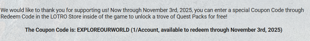 Разработчики продлили действие купона EXPLOREOURWORLD, который дарует все квест-паки игры до Гундабада включительно. Активировать его можно во внутриигровом магазине.