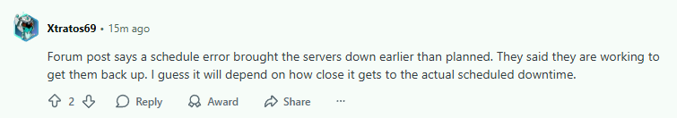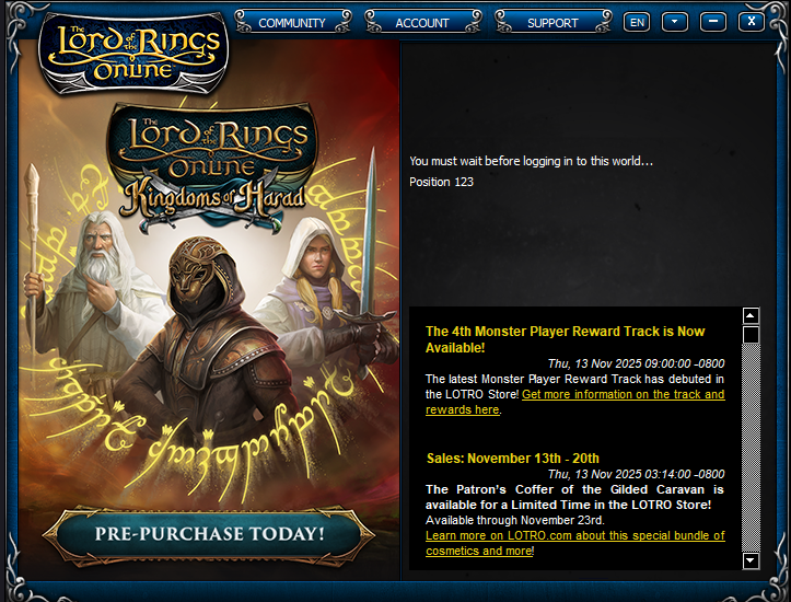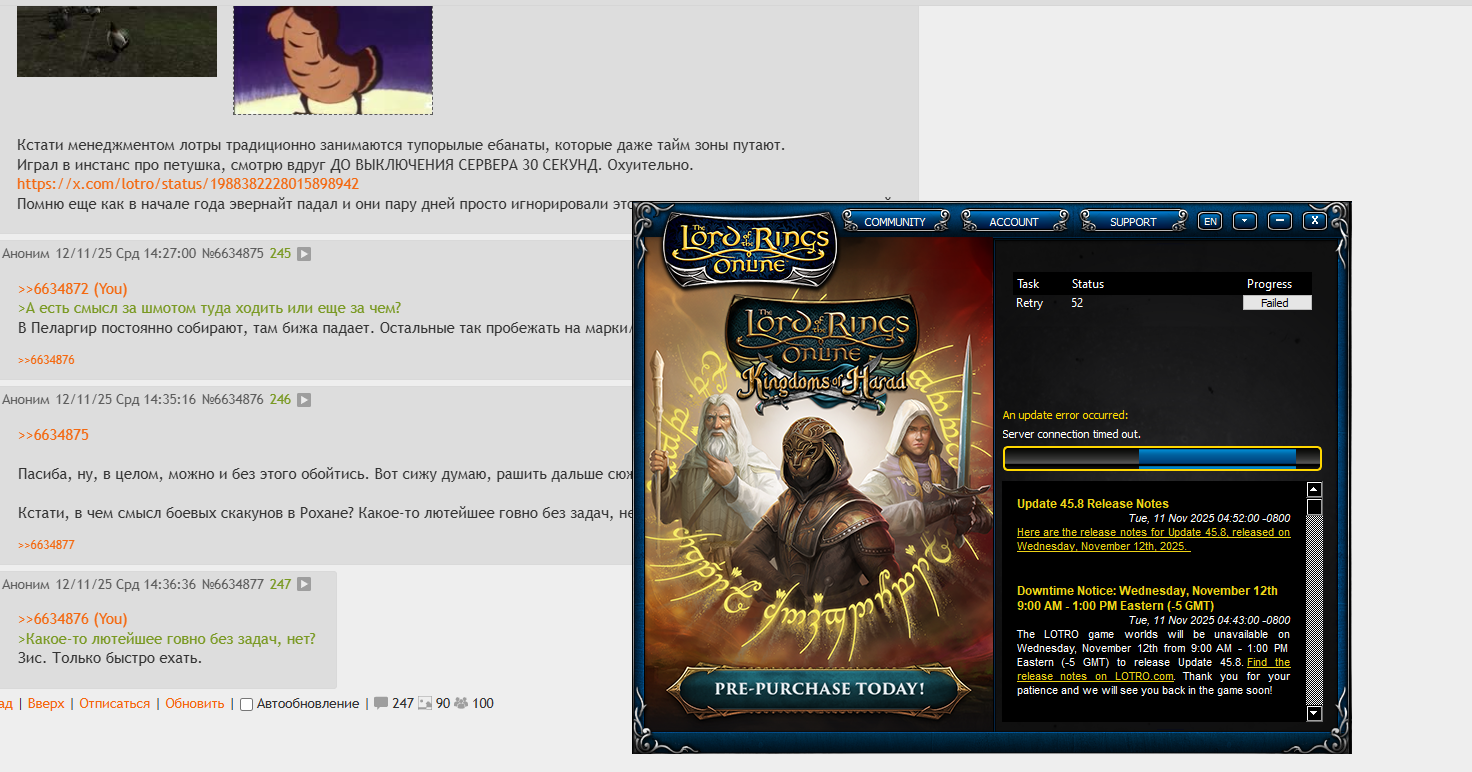 Кстати менеджментом лотры традиционно занимаются тупорылые ебанаты, которые даже тайм зоны путают. Играл в инстанс про петушка, смотрю вдруг ДО ВЫКЛЮЧЕНИЯ СЕРВЕРА 30 СЕКУНД. Охуительно. https://x.com/lotro/status/1988382228015898942 Помню еще как в начале года эвернайт падал и они пару дней просто игнорировали это, ничего не писали, настолько похуй.