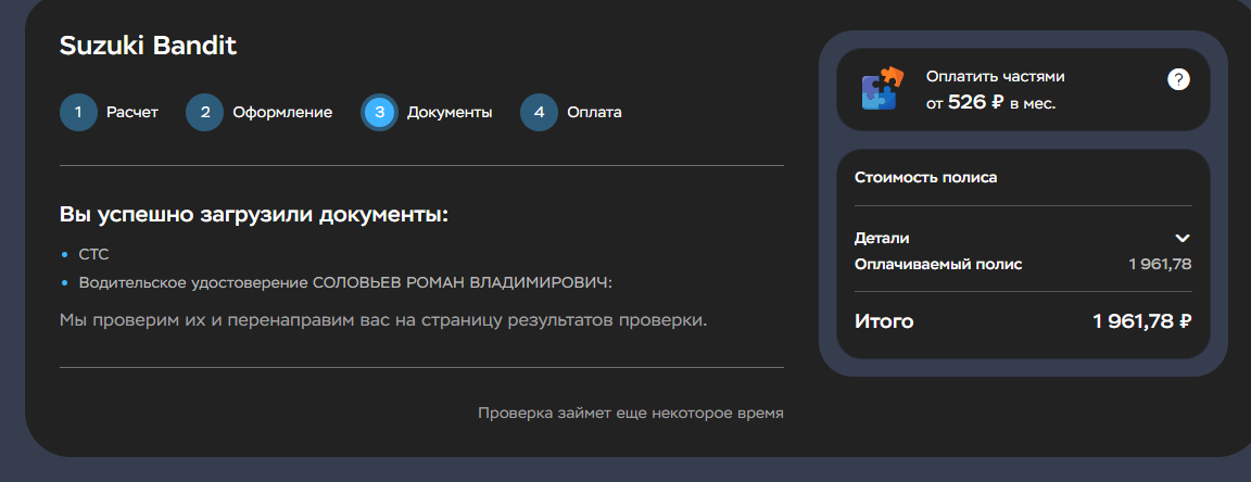 >>462694 Я забыл в этом году оформлять страховку онлайн. Заняло секунд 40, скриншоты делать больше. Введите госномер - выберите период - выберите контору - подтвердить - оплатить - спасибо - до свиданья. Готово, активно с минуты