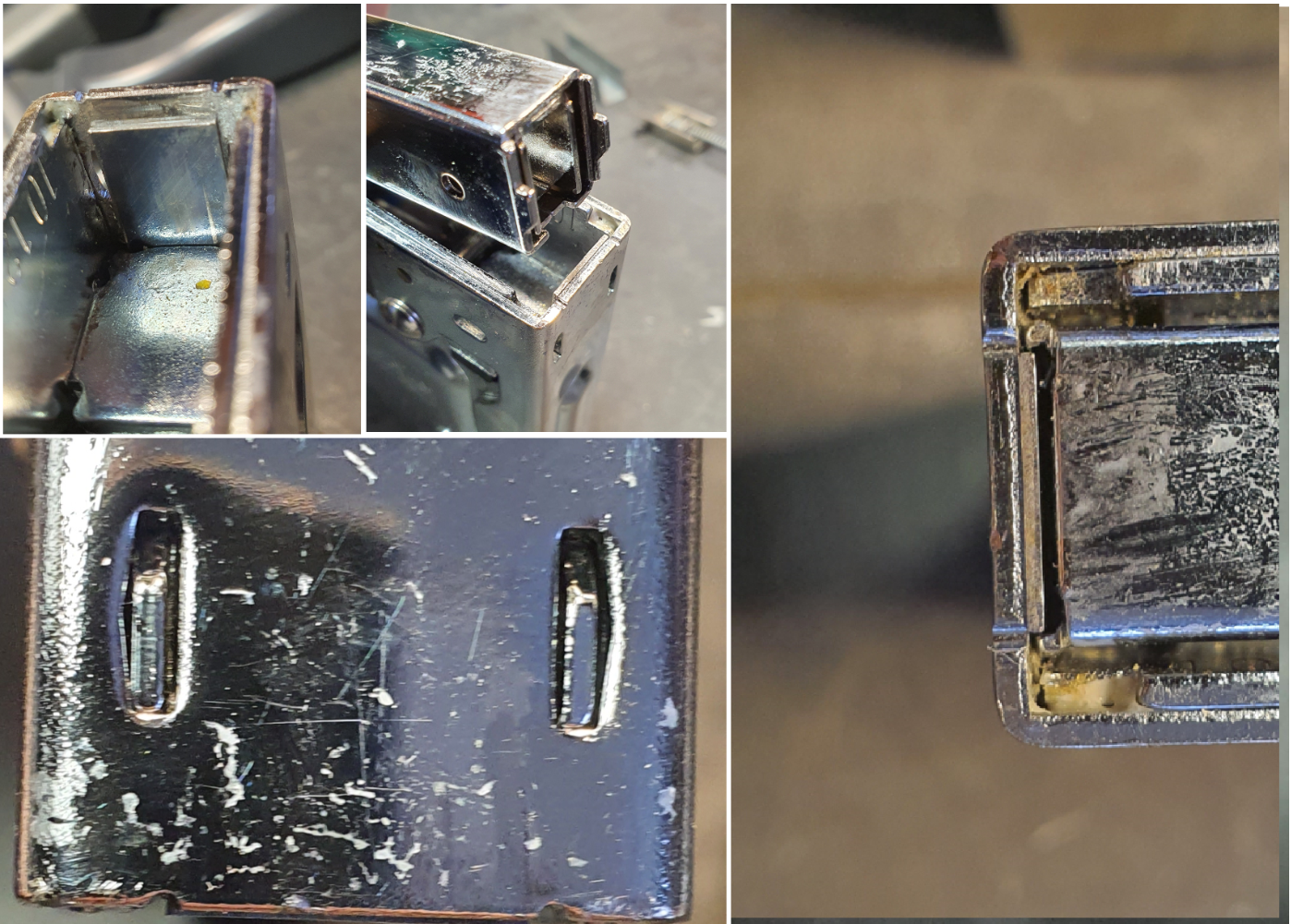 Стальной китаец (пикрил3) Передняя стенка китайца гладкая и не вызывает вопросов, но боковые ограничители выполнены не на стенке, а на съемном магазине для скобок и на нижней левой фотке видно, что от развигания их держат криво продавленные отверстия в передней стенке. У пистолета также довольно широкий зазор сзади молота и иногда случается застревание скобок, когда в щель пролазит сразу 2
