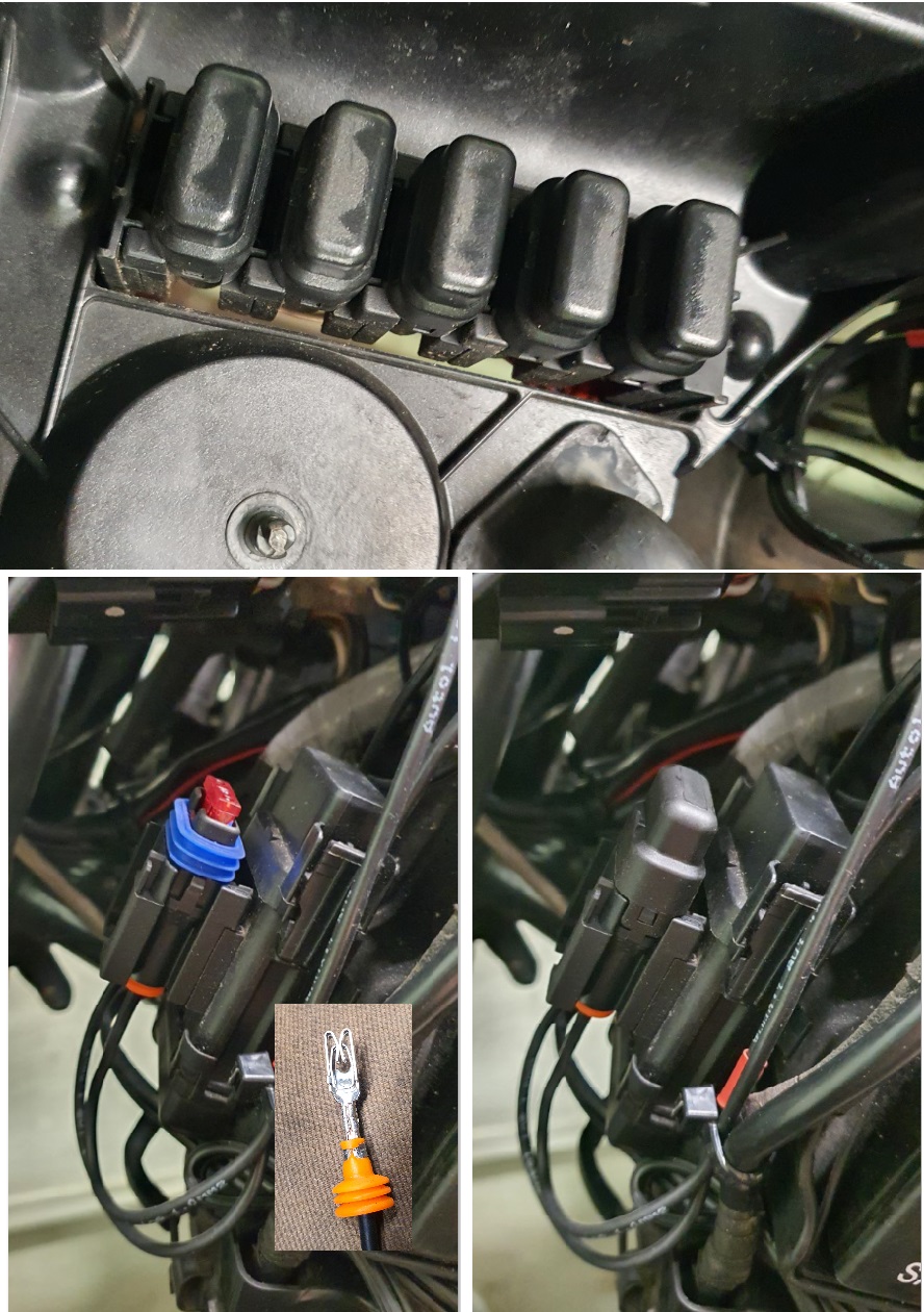 Вывел вниз где планировал и нашёл место для разъёма (естественно его не видно, в этом весь смысл). Но он будет постоянно использоваться, при снятии бака (например для замены воздушного фильтра) и поэтому должен быть легко доступен.