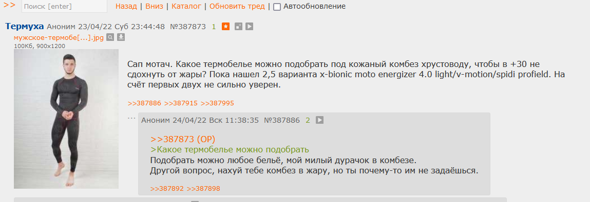 >>387940 >Тебе нужны аргументы, что в разных условиях есть разные угрозы, от которых надо защищаться разным методами Есть 3 вида угроз на мотоцикле, удар под прямым углом, удар по касательной и так называемая скользячка. От какого урона кожаный комбез с эирбегом (мы ведь не луддиты, правда, любитель блоггеров?) Защищает хуже, чем хоккейная маечка или текстильный куртец? >Или ты не понимаешь принципа функционирования термобелья? Я понимаю принцип фунциклирования маркетинга. Когда дурачкам впаривают дичь, а они потом опавдывясь перед собой за потраченные шекели будут усираться только без аргументов, дурачки же с пеной у рта и называть всех вокруг шизиками. Вон тебе соседний тред высокий достижений. Мальчишка на ямахе приезжает первый в своём перфорированном от плеч и до коленей комбезе, открывает куртец - а там армяне в нарды играют даже майки нет. Там маркетологи не могут в уши ссать, как тупому двачеру, пичальбида. >в эпоху Так, шизом назвал, блоггеров приписал, рядники чек. Почти бинго, дурачок, продолжай.
