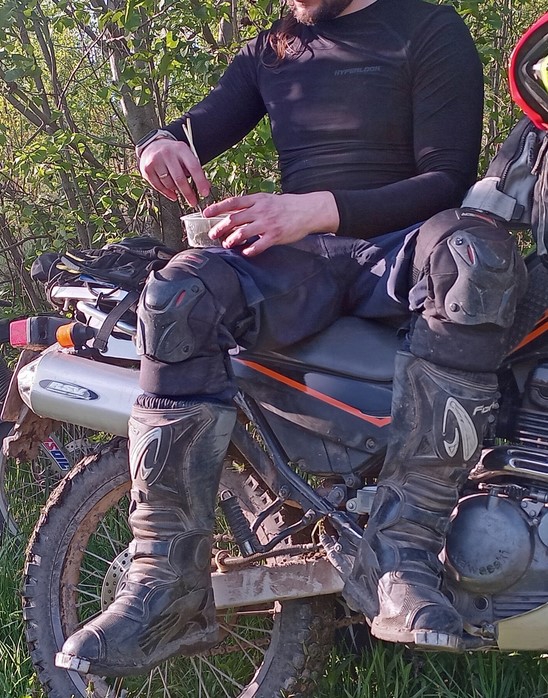 у меня такой сетап, по езде что то типа как у ОПа. имею брюки и штаны fly patrol. мне нравится. куча карманов и вентиляшек, ничего не отрыгнуло. под куртку черепаха тор. на пожарче с куртки отстегиваются рукава и либо джерси подкинуть либо так и пилить с локтями пластмассовыми. кроссовые мотоботы. штаны сверху на боты. колени. на осадки -дождевик штаны куртка отдельно, нонейм из туристического магаза. термуха снизу само собой по погоде толщиной. до +5 в этом терпимо было. по бомжу без гортехов но функционально, лично для меня. фото старое, еще обтрепался