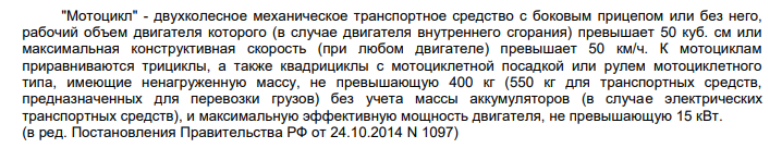 >>450933 >По факту же ВС в постановлении 11-АД19-17 признал эту хуйню ТРАНСПОРТНЫМ СРЕДСТВОМ. Это очевидно если прочитать определение мотоциклов, мопедов и т.д. в ПДД. То, что некоторые особо хитрожопые особи называли это "СПОРТИНВЕНТАРЬ", так оно мотоциклом быть от этого не переставало.