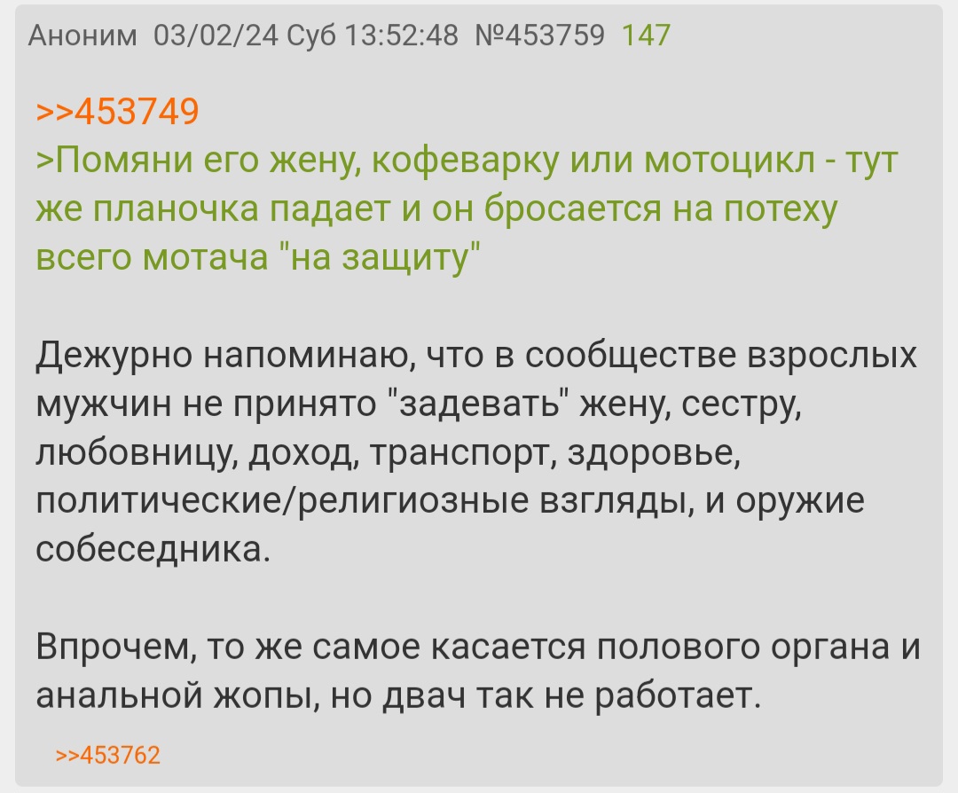 >>461937 >>460674 Я не впечатлён. Не разочарован, но и не впечатлён. Фит-энд-финиш у энфилдов действительно на 4 с жирным минусом. Не такое пиздец гавно, как мотолэнд какой-нибудь, но до китайского "премиума" не дотягивает. Бенелли, воуги и цфмоты с бендами - это просто другой уровень по сравнению с индусами. Подгонка деталей, материалы, зазоры, люфты, проводка, окраска, хромирование; где-то по мелочи, где-то конкретно, но практически во всём индус выглядит более дешмански и жиденько. Особенно не понравились всратые пульты на руле: хочется добавить "нефункциональные", но, возможно, привыкнуть к ним вполне реально. Но лично у меня они вызвали какое-то отторжение прям. Зато приятно удивила посадка на интерсепторе, заявка на самую конфортную и классическую посадку среди халфлитров. На континентале - ну такое, локти враскоряку, ноги хуй пойми где, весь вес ложится на мошонку. На 350, кстати, тоже посадка не понравилась, далековато вынесены ноги, на неровностях не привстанешь, придётся тянуться за руль как на турнике. >>462043 Для города - вполне хватит всего, в чём есть больше 125 кубов. Потому что скорость в городском траффике зависит не от того, насколько у тебя мощный мотор, а от того, какие у тебя тормоза в голове. Адекват на литоре может и не захотеть шпарить со скоростью ебантяя на минчике, который херачит сотку по стоящей пробке. И если кто-то тебе начнёт рассказывать, что 50лс50нм ему в городе нихватает - смело харкай ему в ебало, это или диванный, или траль. За городом, скорее всего, тебе будет хотеться положить стрелочку на 120...170 (в зависимости от наличия ветровика и желания отвалить на штрафы ползарплаты) и при этом, по возможности, не слушать рёв надрывающегося из последних сил движка и не ощущать жопой вибрации одноцилиндрового мотора в пурпурной зоне оборотов. Но это не значит, что на малокубатурках вообще нельзя путешествовать, просто это совсем другой темп и совсем другое настроение. И если кто-то говорит тебе, что для дальняков нужны минимум 100лс100нм, харкай ему в ебало тоже. Вот смотри, как я это делаю: Слыш, >>462045! АХРКТЬФУ те в ебало! >Почему же тогда на дваче топят онли за 600+? Это литералли инцелы мотача, которые нерушимо убеждены, что для секса нужен хуй от 20см и рост от 2м, а для езды - минимум 600 кубов и минимум 100лс100нм. Вот один такой носится и в каждом треде фотками своего литора тугосерит. Не занимается компенсацией, твёрдо и чётко.