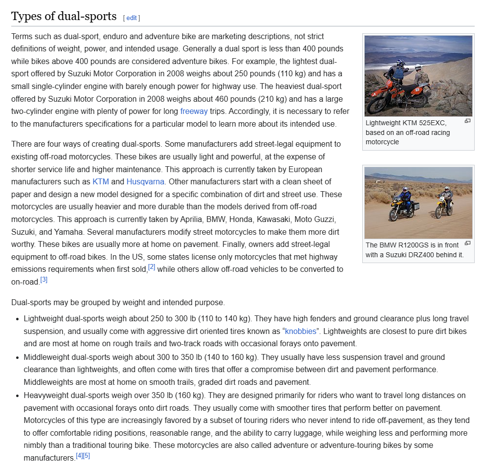 >>476097 >Разве что двойной спорт. Собственно сабж. На самом деле дуалспорт - переходное между турэндуро и собственно эндуро. Вес в районе 160 кг, мощность 40..70 лошадей, подножки пассажира. Есть еще вариант - супермото, то же, но на более асфальтовых колесах (пик3)