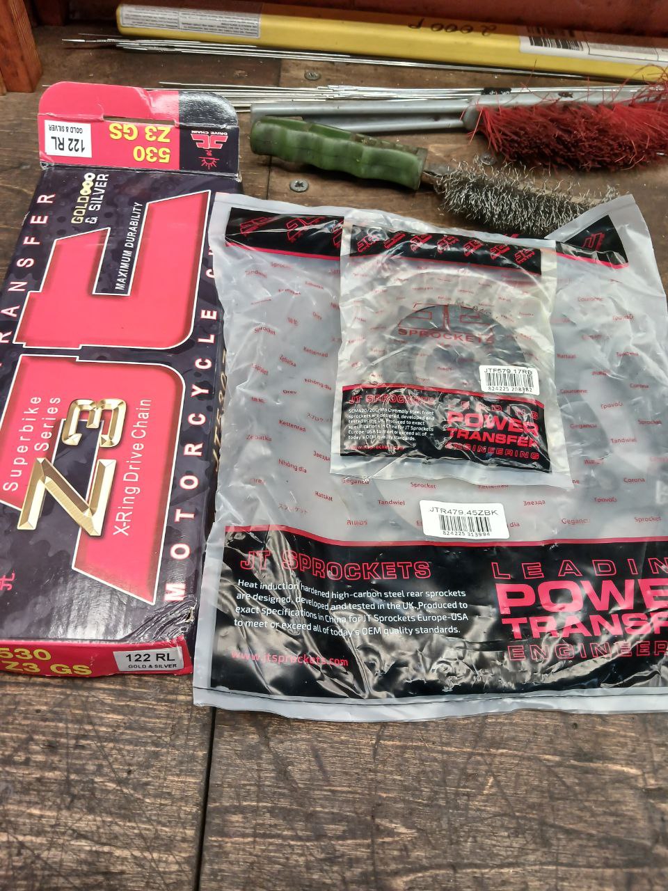 От предыдущего хозяина в наследство перешёл комплект звёзд JT + 530MVXZ от фирмы ЕК. Он благополучно отжил тысяч 25, причёт цепочка ушатала аж 2 комплекта звёзд. Установленные изначально алюминиевые PBR деформировались от нагрузок тысяч после 4, а вот JT стоически насиловались остальные 20км. И, честно сказать, ещё на несколько к км их бы хватило. Но бабки есть, значит меняем!