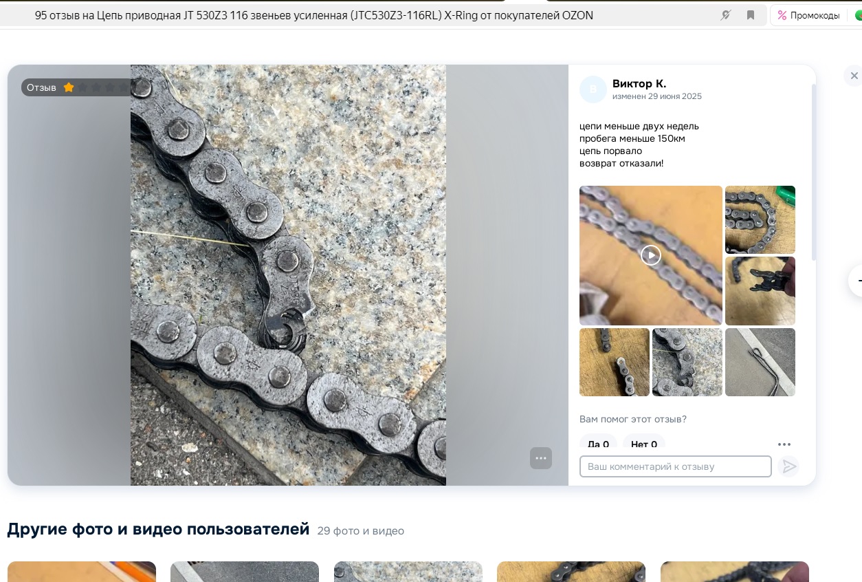 Добавлю, пока разлетается заводская смазка и не накручено даже тыщщи, всё будет нормально. Ждём первичной растяжки. Склонная к тянучке цепь проявит себя на первой 10 пробега. Врятли я столько накручу за сентябрь-октябрь, поэтому цепной вопрос на этот сезон закрыт.