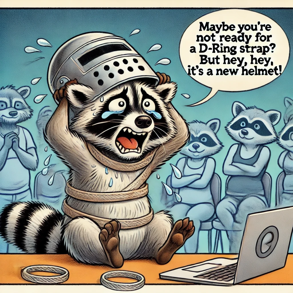>>485650 Енот решил купить себе новый шлем и, следуя совету более опытных, выбрал модель с застежкой D-ring. Радостно натянув его на голову, он потянул за ремешки, пытаясь закрепить, но что-то пошло не так. Вместо того чтобы застегнуть, он запутался в кольцах, а ремешок затянулся так, что голова стала словно в тисках. Пытаясь освободиться, енот только сильнее запутался, пока ремешок не прижал ему уши.