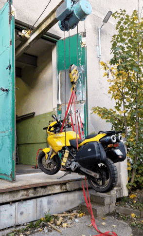 В этот раз решил ставить не в гараж, где холодно и хуй соберёшься что-то поделать, а в мастерскую, где тепло-светло и я бываю раза 4 в неделю как минимум - хоть ради этого конечно пришлось с большой буквы Заебаться с освобождением максимально удобного места и поднимать мотоцикл на эстакаду тельфером.