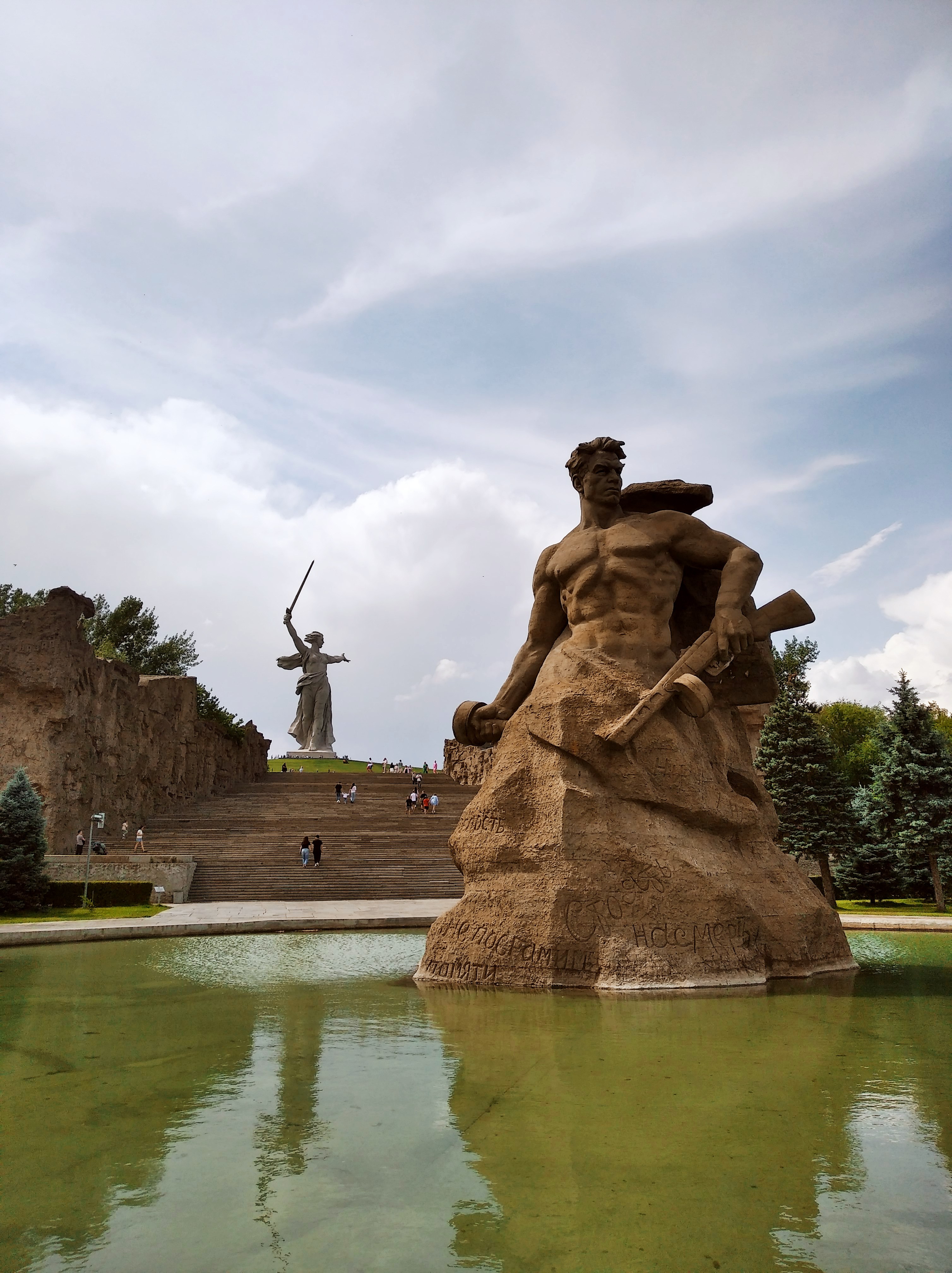 Сегодня опять весь день в дождевике. Снял только, чтобы прогуляться около тётки с мечом. По завету дяди Андрея Бересневича, оставил все вещи на моте и ушёл гулять. Тётка на месте, каменные соски торчат, а вокруг ходит куча СВОшников. Кто без ног, кто на костылях ,капец. Удачно попал ещё под смену почётного караула. Прогулялся по всему комплексу, и вы меня извините, аноны, но читая надписи в стенах мемориалов у меня ком в горле стоял. Каждый раз. Эх..
