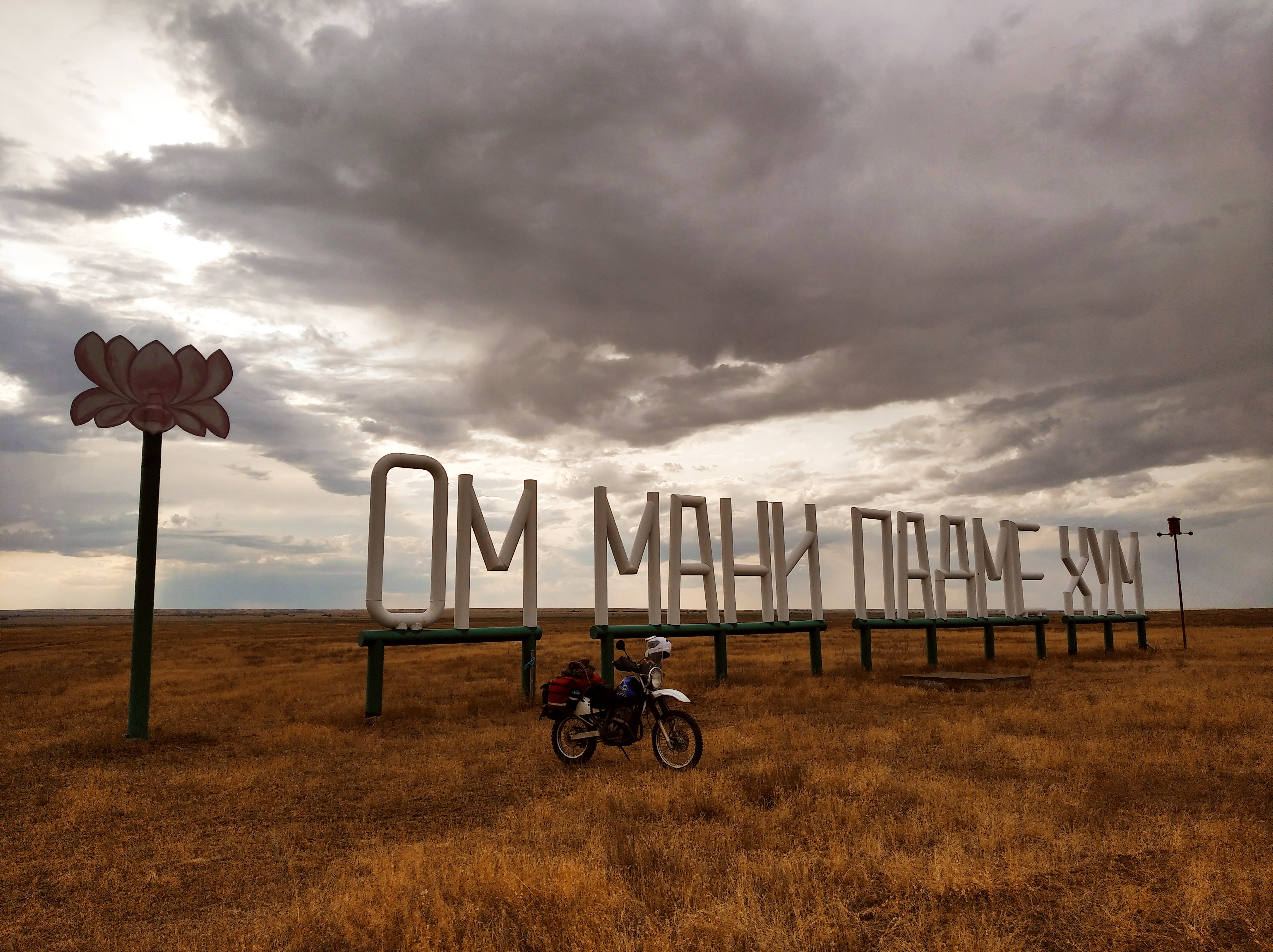 Обязательно, всенепременно потом пошёл дождь. И вкупе с сильным ветром и павшей на 10гр температурой, это тот ещё эстрим. Так я доехал до Элисты и посетил главный Буддийский храм. Это нечто, аноны. По крайней мере для меня. Ни в церкви, ни в синагоге, ни в мечети я не чувствовал подобного спокойствия и внутренней тишины. Прошёлся по всему комплексу, покрутил барабаны, почитал тексты и двинулся дальше. Тут, как и с Мамаевым Курганом мне повезло и светило солнце. Только я собрался и кааак полило. А мне как-то надо выезжать. Телефон не достанешь, ибо замочишь, пока стоишь на светофорах. Инета нет во всей Калмыкии, терминалы не работают, все ругаются. Короче, я вроде спокойный анон, но взбесился от того, что не мог выехать по наитию, лило, как из ведра, РЕКИ коричневой воды на асфальте, которой меня постоянно обдают перестраивающиеся машины. Плюнул, заехал под навес на шиномонтажку успокоиться. И тут приезжает хозяин шиномонтажки - весёлый дед-дагестанец-альбинос. Прикольный такой. Пригласил к себе, угостил кофе, пожелал счастливой дороги и попрощались. Потом вытерлись.