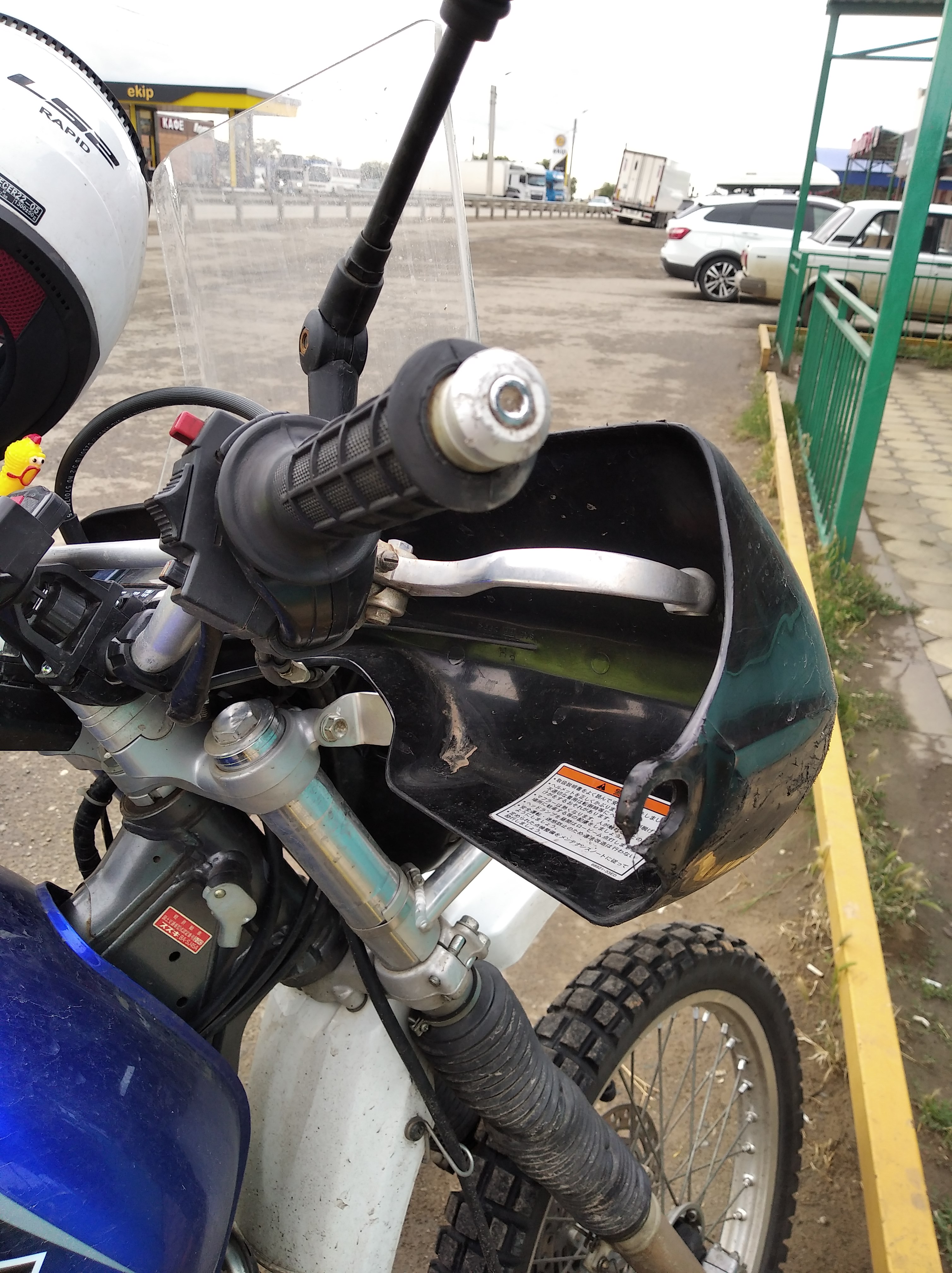 И тут, МЕНЯ СБИВАЕТ ФУРА НАХРЕН! Ну, не меня, я кушал, а мотоцикл. Поворачивая, она углом прицепа задевает мот за кофр и отшвыривает на бок. Ладно, кофры мягкие, взяли нагрузку но себя, но вот правая защита рук всё, ёк. И приборка немного криво стоит теперь. Подплавил зажигалкой пластик защиты и кое как вставил на место. Вроде держится пока. Обидно.