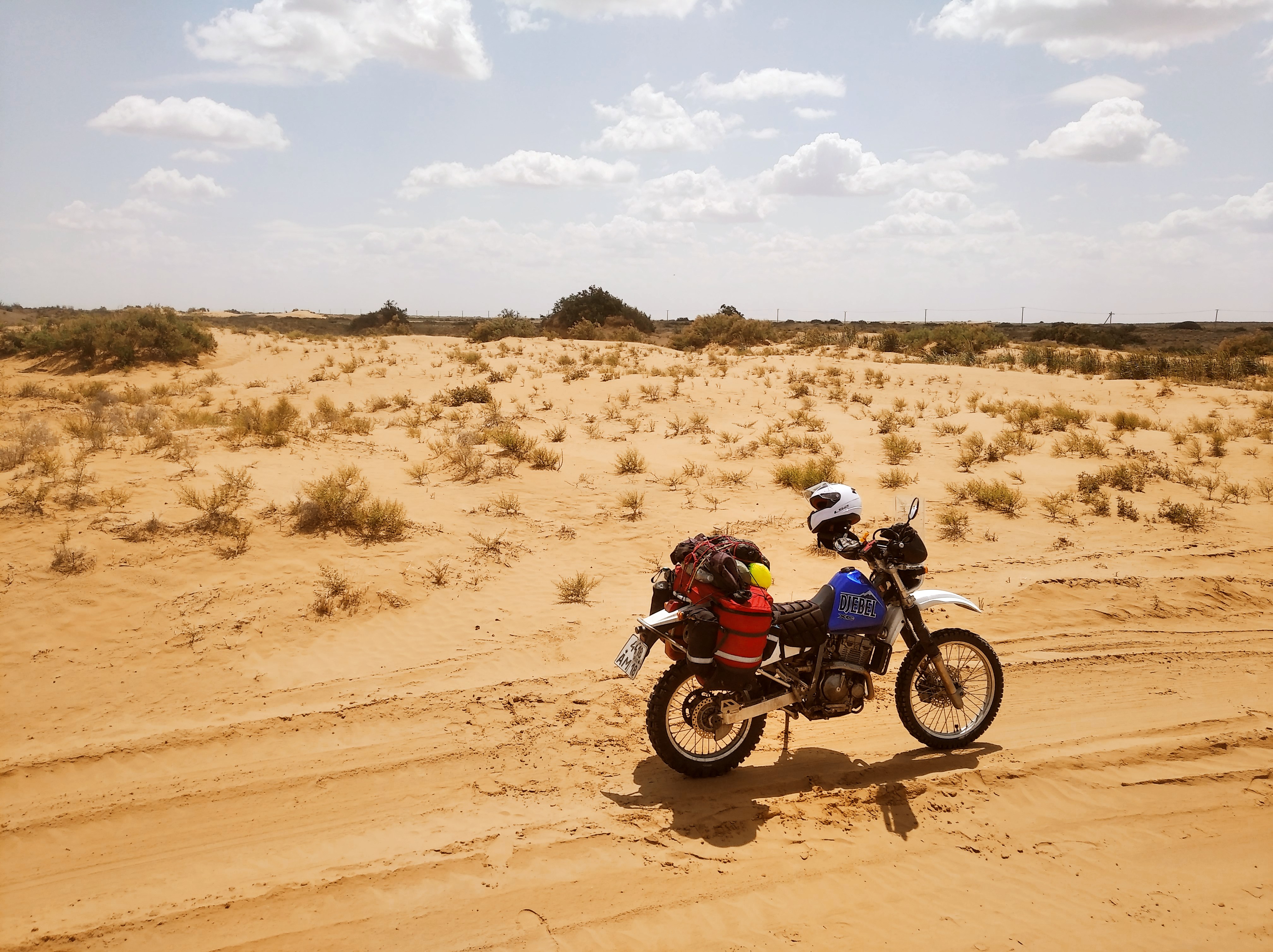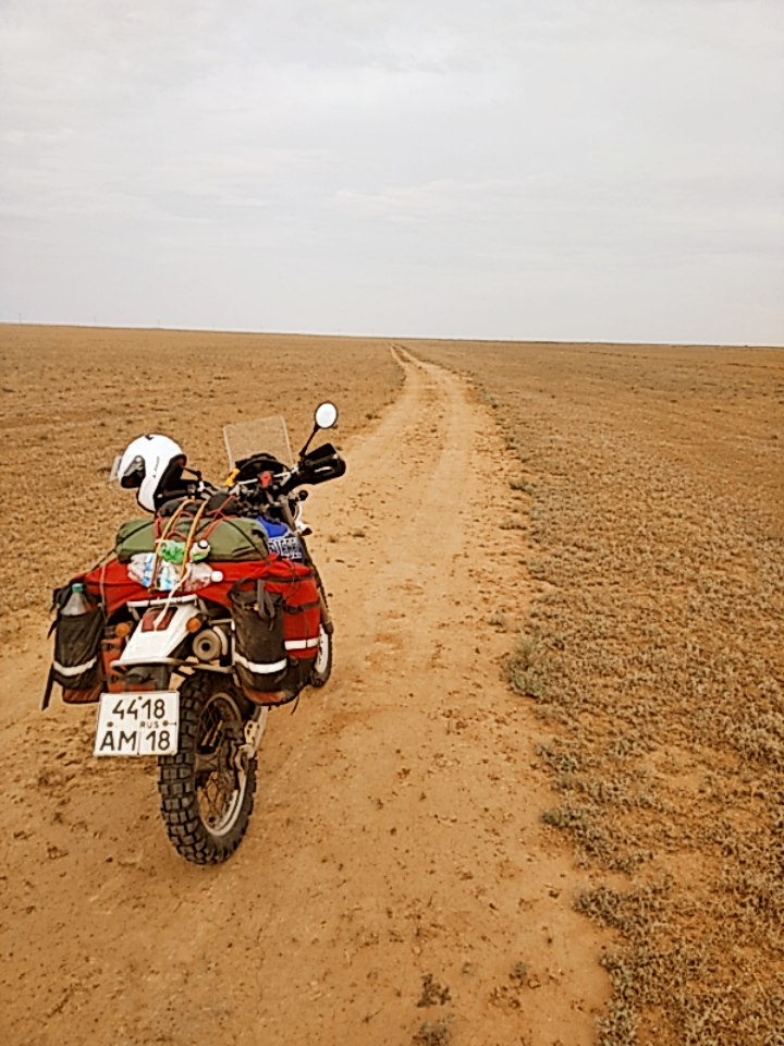 Короче, заночевав в пустыне, я попал В УРАГАН НАХРЕН! Капец блин. Было жутковато, ибо я в 50км от дороги, вокруг нихрена, колышки все сорвало, держал руками. Боялся, что повалит мот, а выйти из палатки не могу, ибо её тут же унесёт или порвёт. Дождался послабления ветра и выглянул посмотреть, куда его можно положить. Некуда блин.