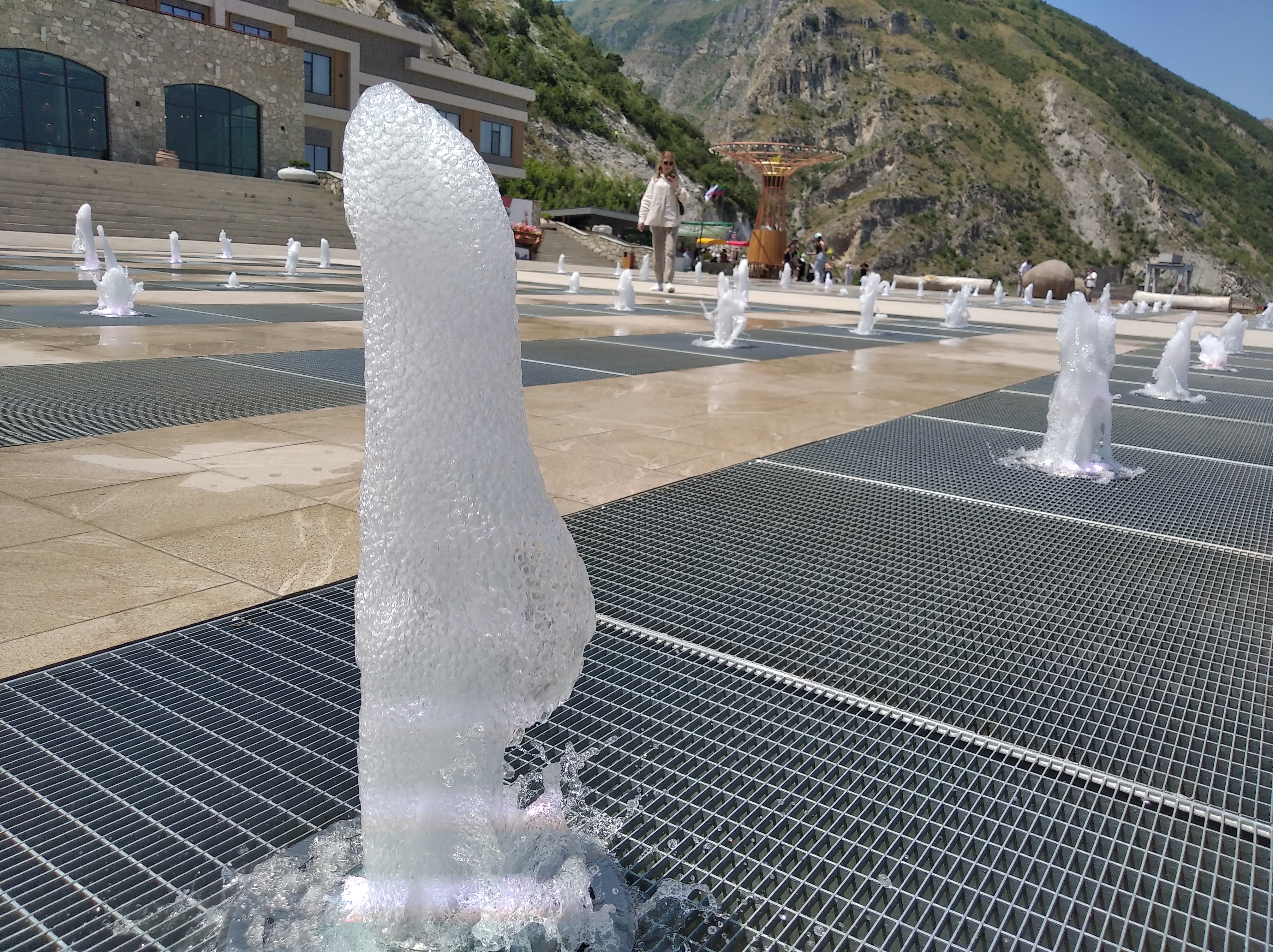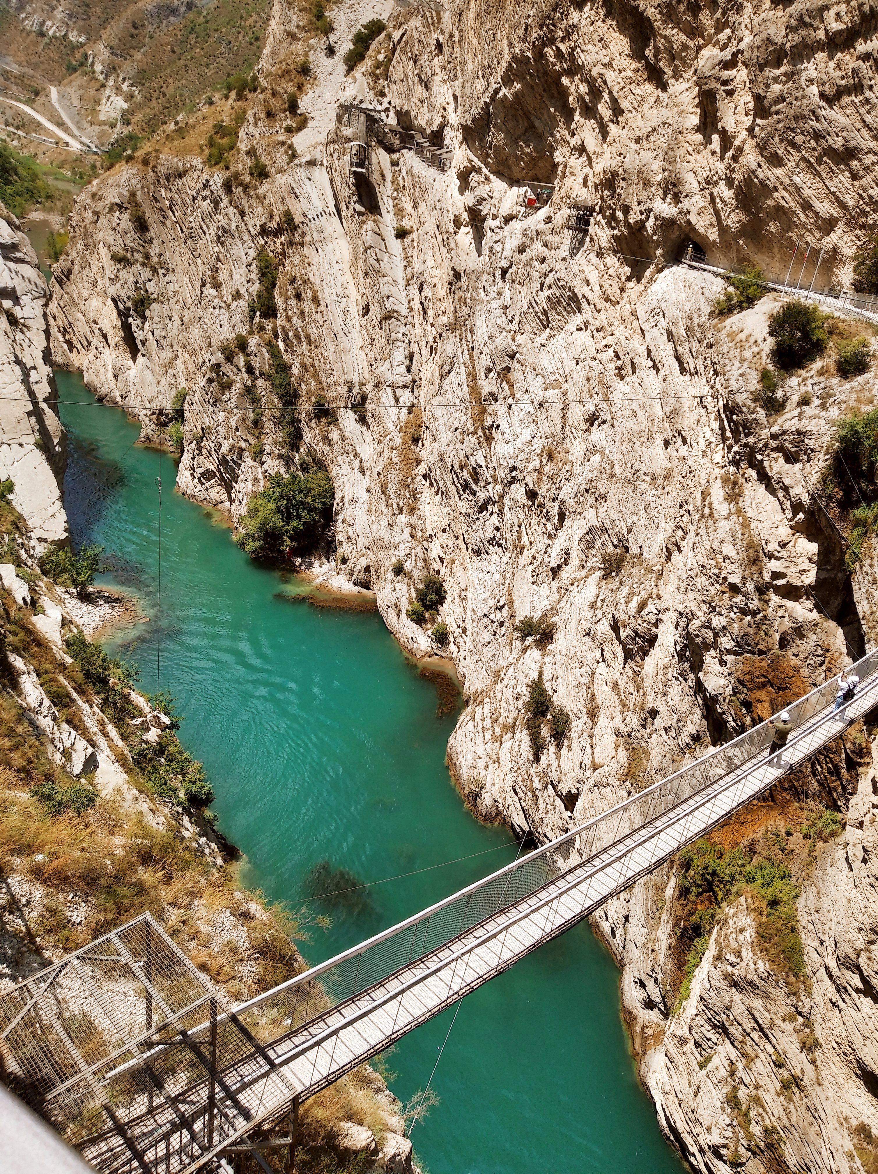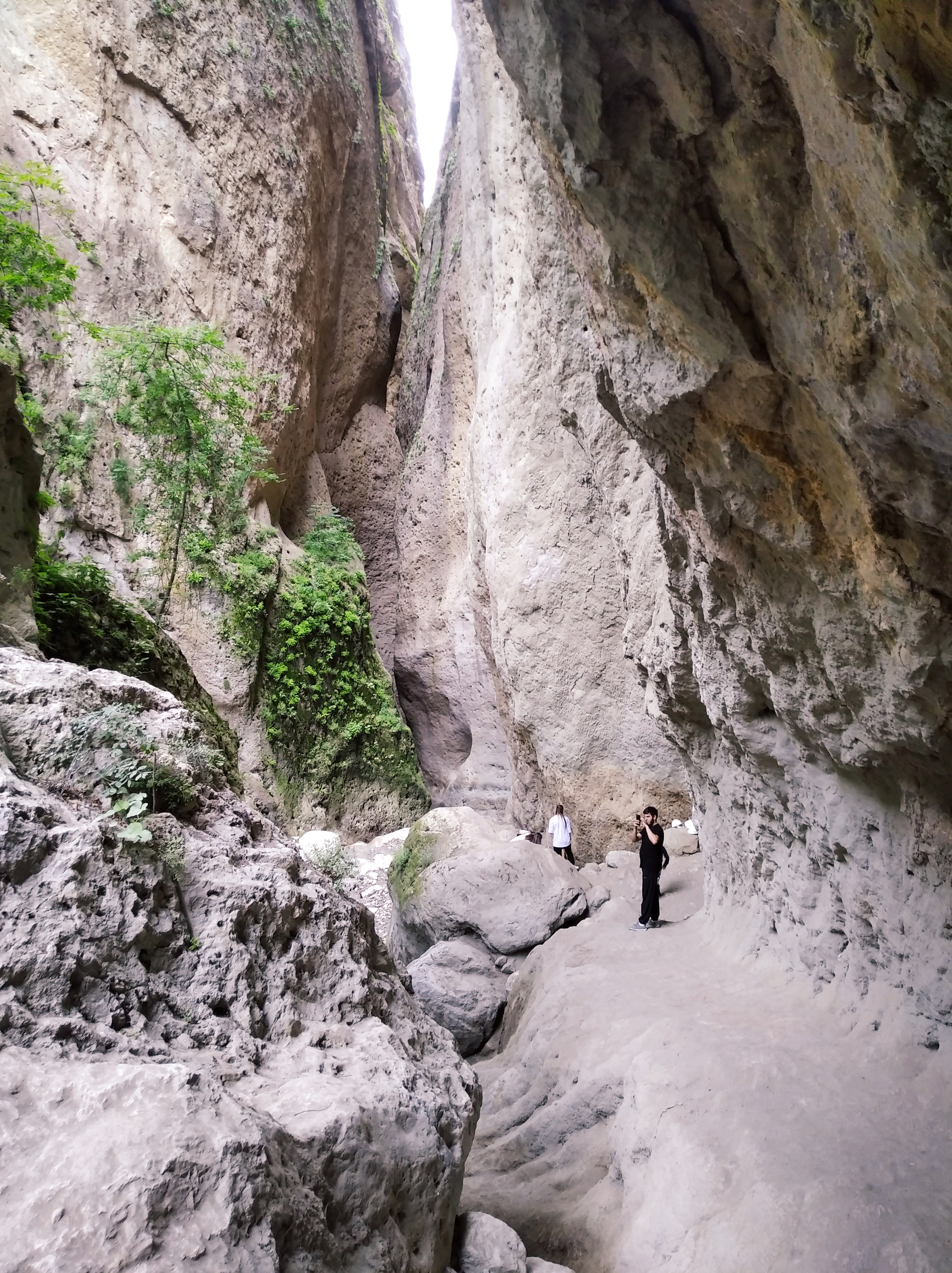 Далее по плану был Сулакский каньён. Но, я куда-то не туда свернул и попал к какой-то пещере. Куча туристов, автобусы ,вход 500рублёв и выдают КАСКИ. Пошёл. И не зря! Сама пещера прикольная, а далее начало Сулакского каньона и подвесной мост на высоте метров 100. Вид шикарнейший. И тарзанка с гигантскими качелями. Ухх блин. Посмотрел, как люди летают и думал, лететь не лететь. Долго решался, минут 15. На Алтае я прыгал с тарзанки, но там высота поменьше была. Короче, решился. Пошёл покупать билет и настало 12 часов дня. ВРЕМЯ МОЛИТВЫ. И все работники на 2 часа ушли. Вот блин! Тарзанка стоит 7000р, гигантские качели 5000р.