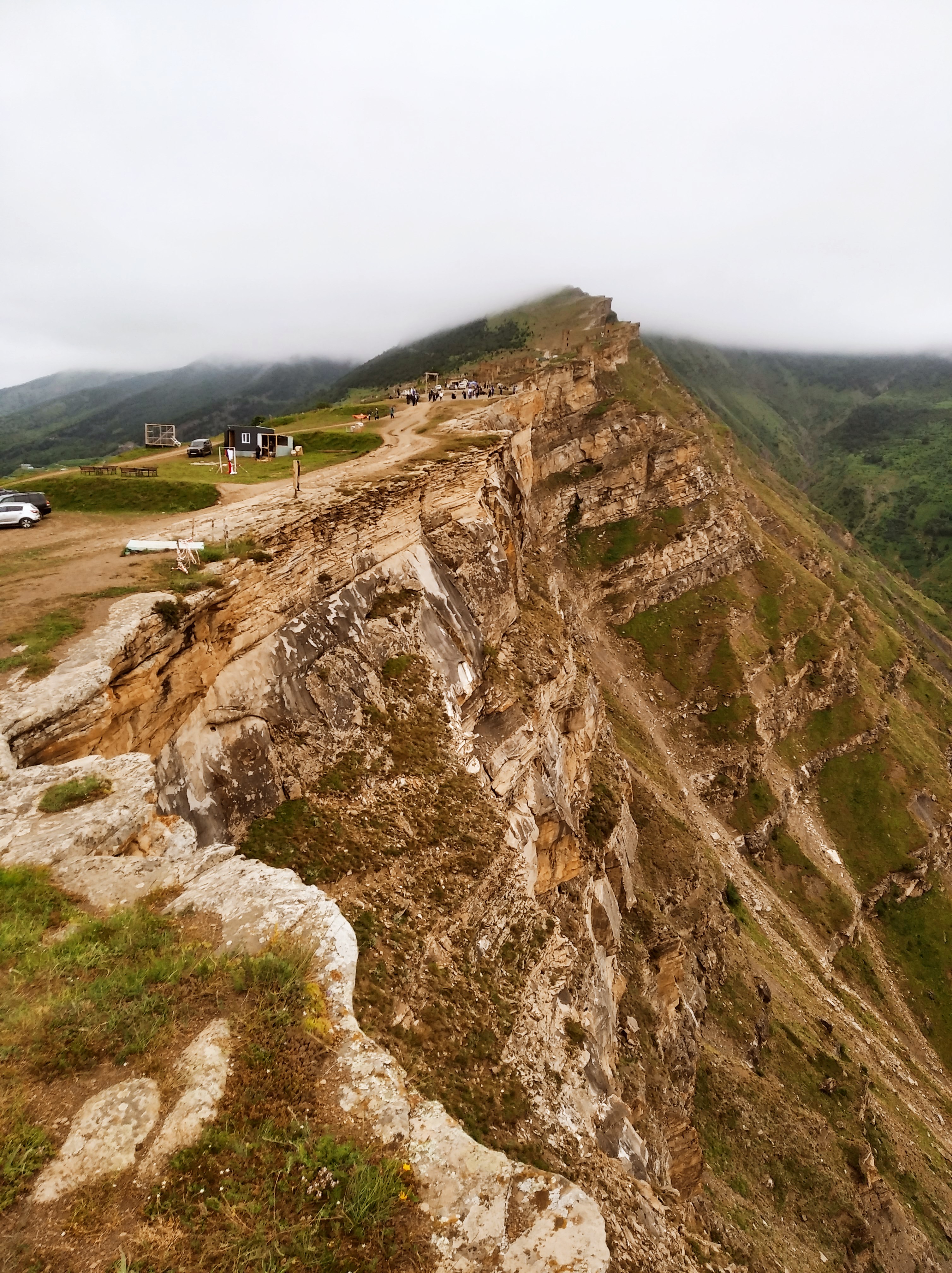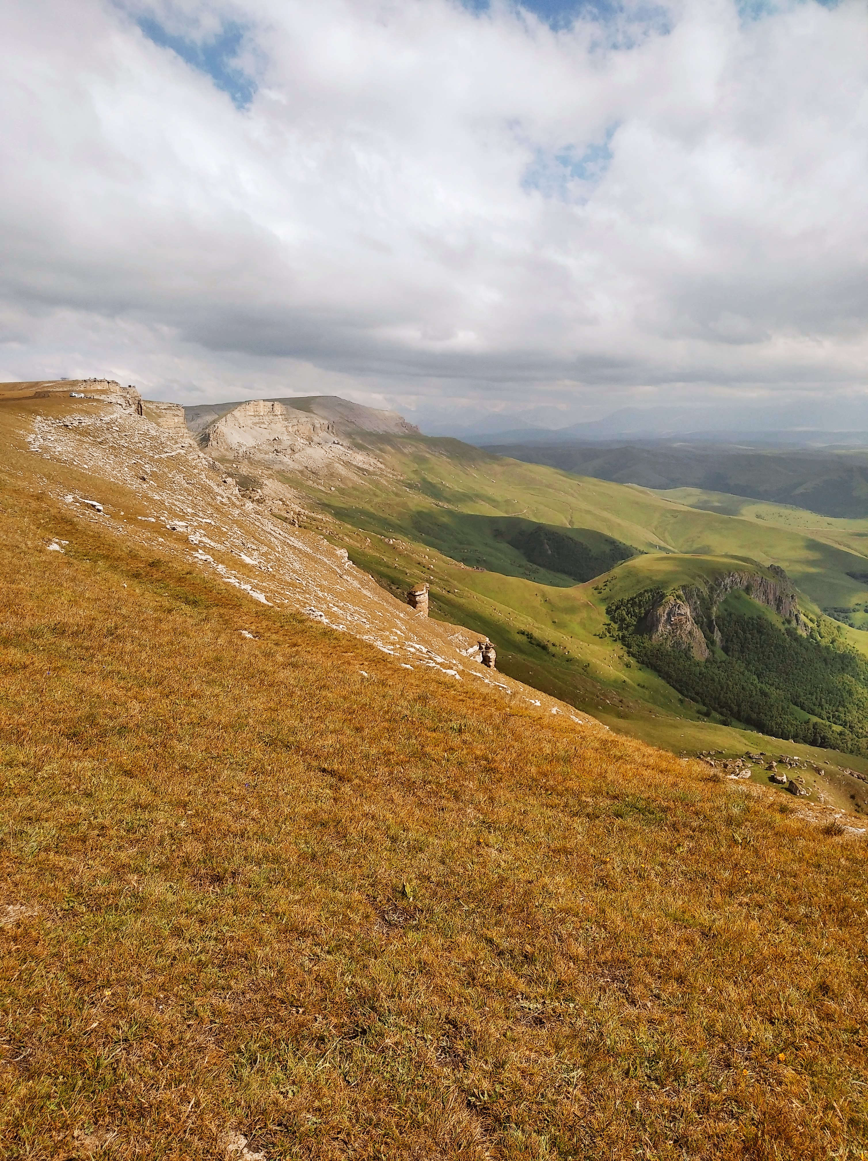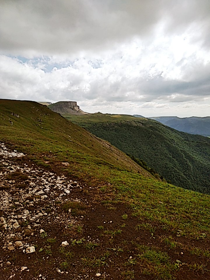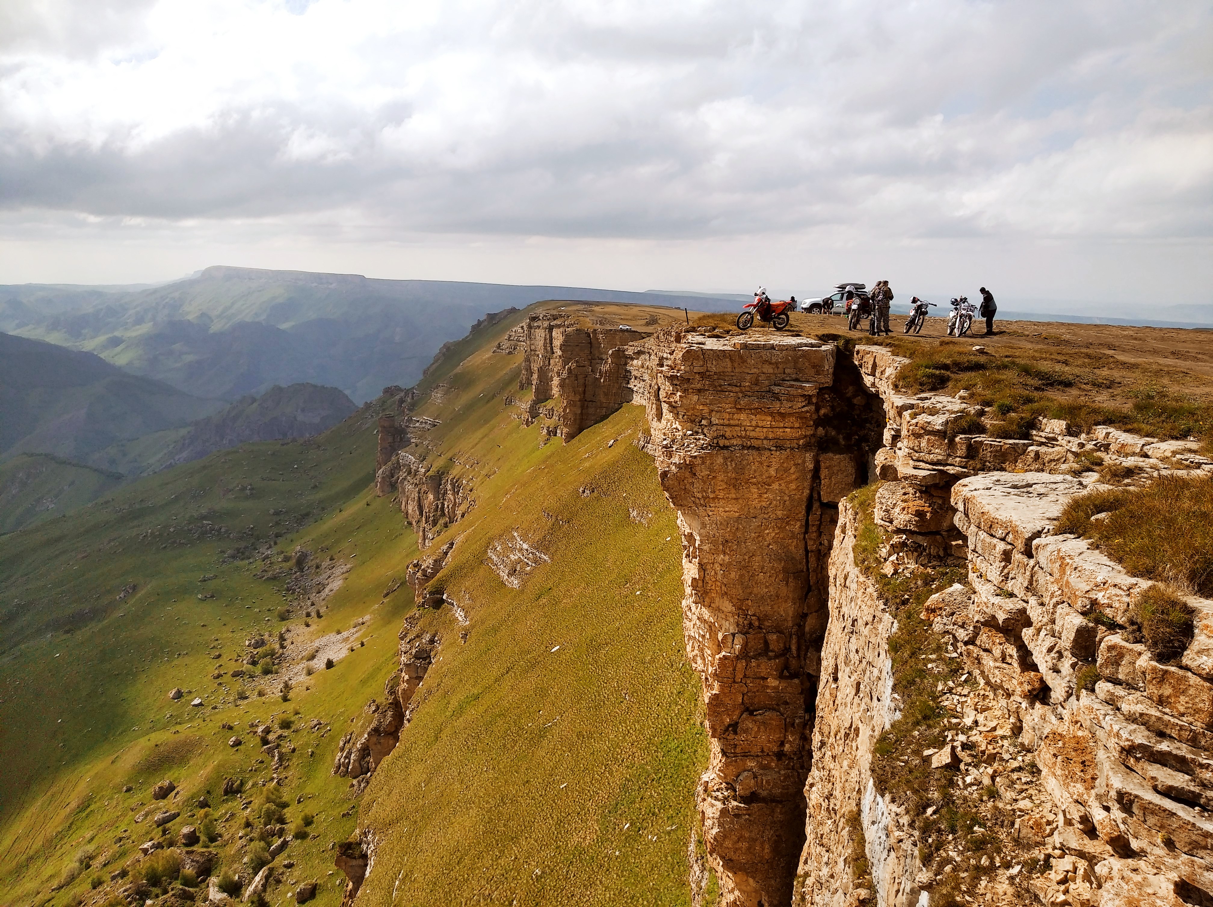 Ещё и легкодоступно. Люди на легковушках сюда приезжают вон. Я приехал сюда часа в 4 и тут же решил остаться на ночь. Нельзя это всё впитать за полчаса. Тут столько висящих над пропастью камней, где можно сесть и ножками поболтать, а под тобой 800м пропасти. Столько дорожек и пологих склонов, где можно покататься. Как же хорошо, что я на лёгком эндуро! Склоны травянистые без выступающих камней, пологие. Одно удовольствие по ним кататься. Часа 3 так делал , останавливаясь и сидя на обрыве по полчаса. Заехал на сааамый высокий пик, куда только решился и куда уже не было следов.