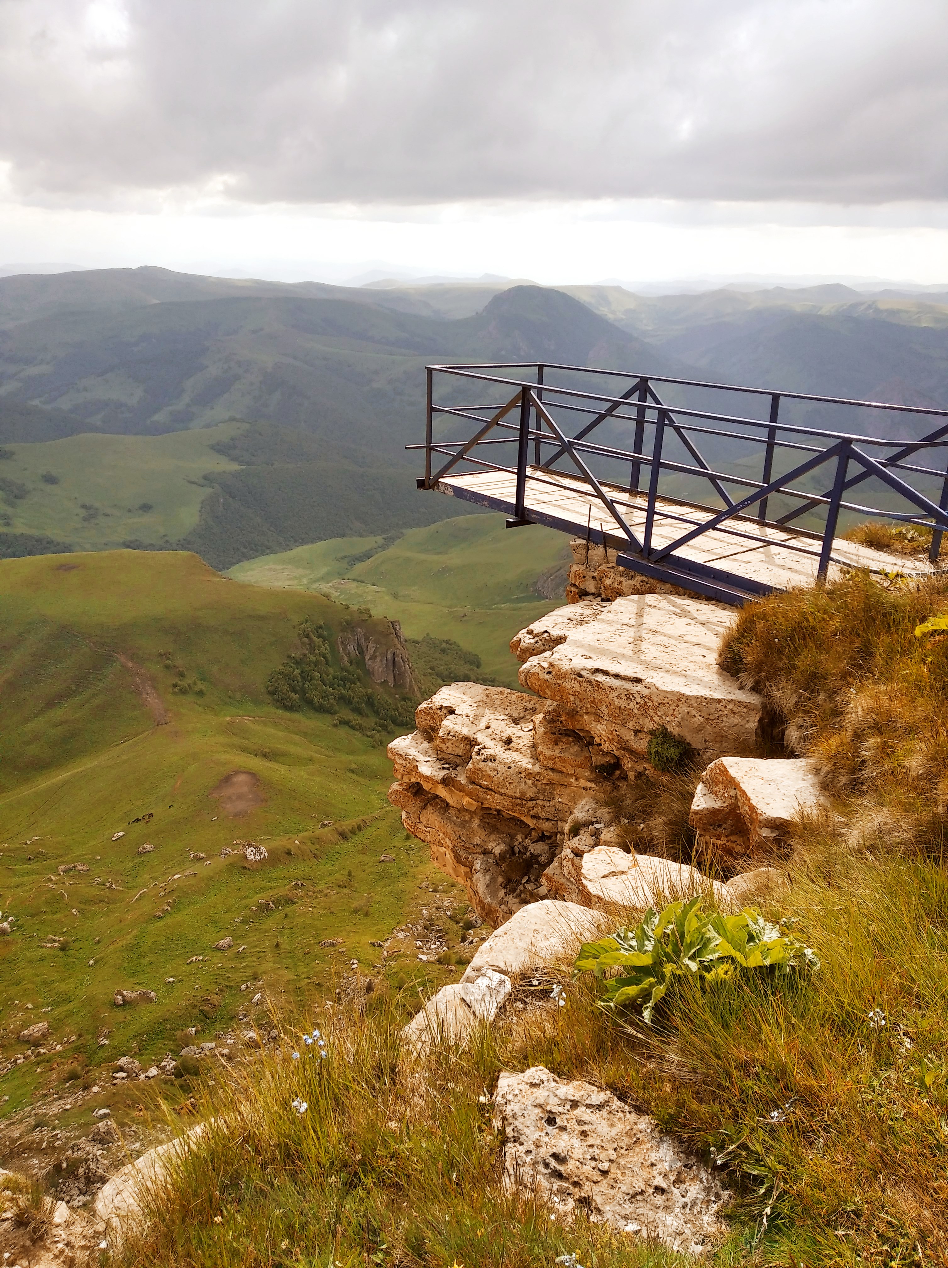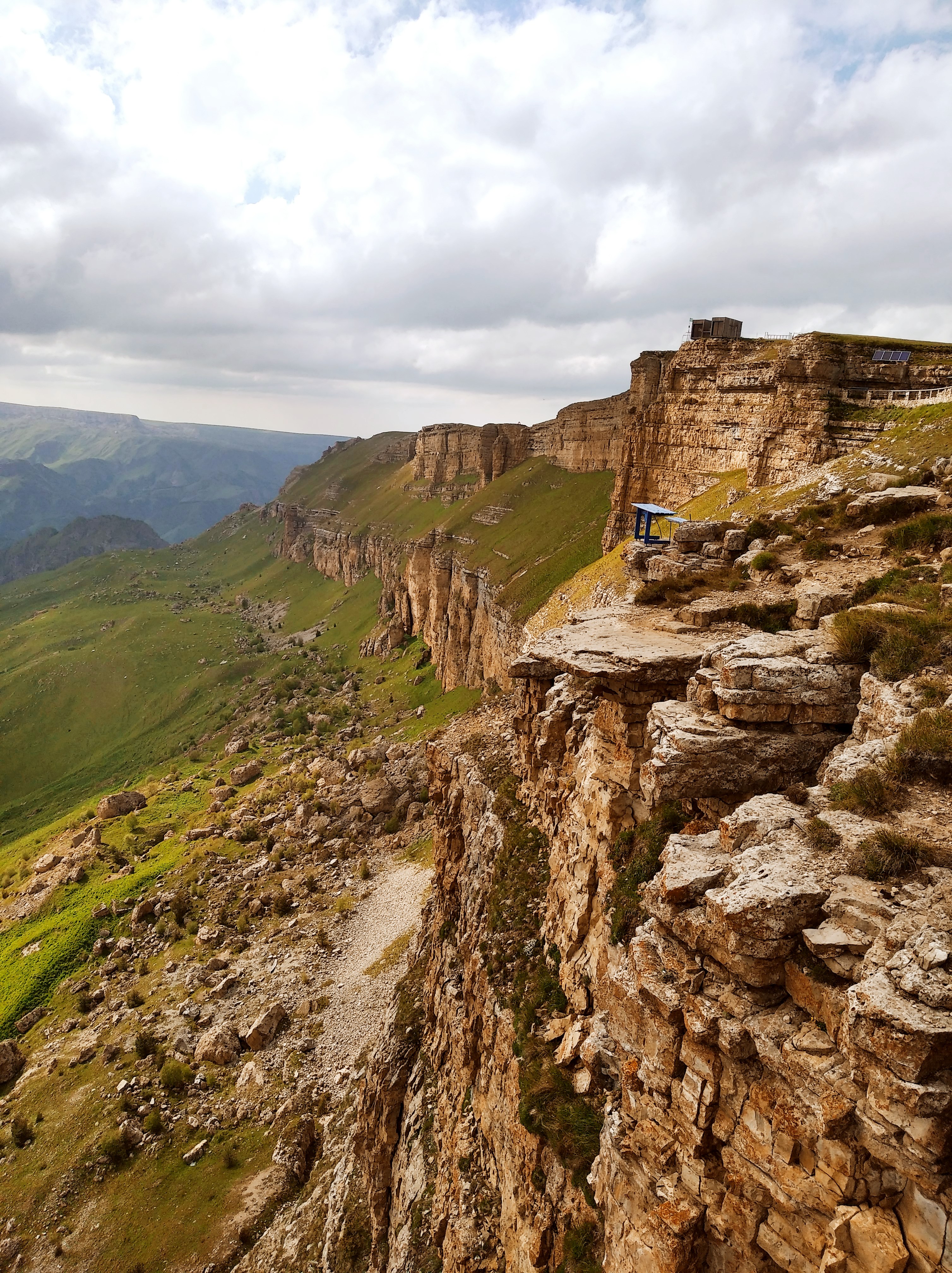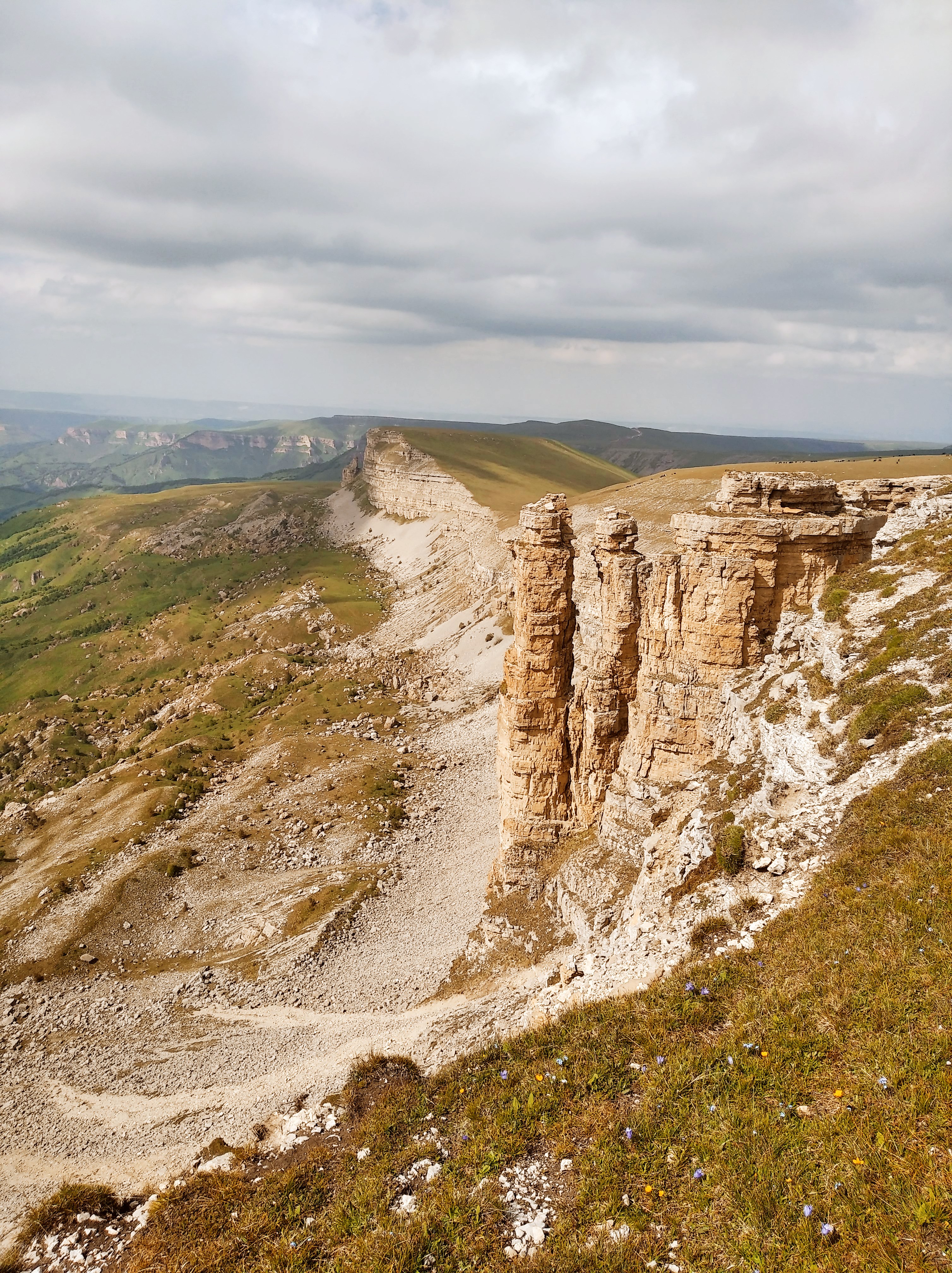 Ещё и легкодоступно. Люди на легковушках сюда приезжают вон. Я приехал сюда часа в 4 и тут же решил остаться на ночь. Нельзя это всё впитать за полчаса. Тут столько висящих над пропастью камней, где можно сесть и ножками поболтать, а под тобой 800м пропасти. Столько дорожек и пологих склонов, где можно покататься. Как же хорошо, что я на лёгком эндуро! Склоны травянистые без выступающих камней, пологие. Одно удовольствие по ним кататься. Часа 3 так делал , останавливаясь и сидя на обрыве по полчаса. Заехал на сааамый высокий пик, куда только решился и куда уже не было следов.