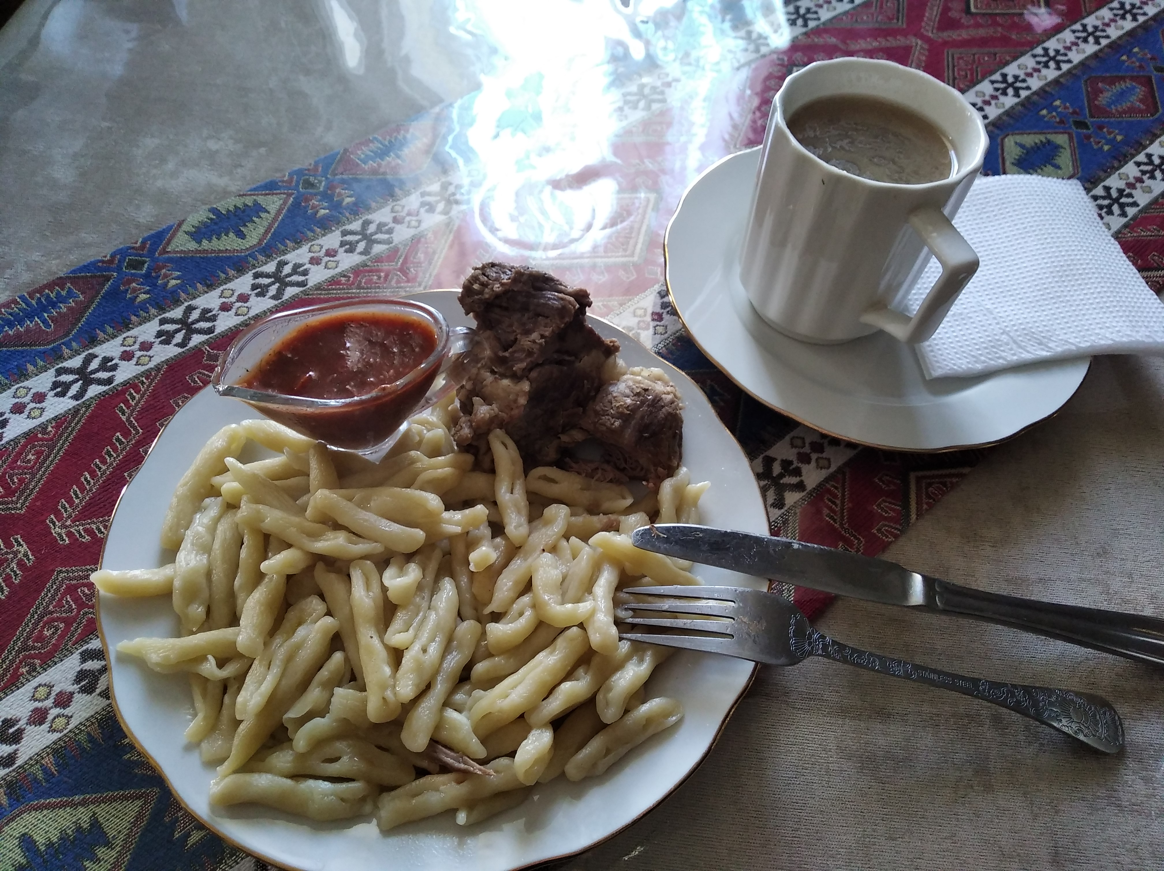 Я уже успел проголодаться и заехал в кафешку калмыцкой кухни. Дратути, говорю, можно мне чего-нибудь национального? Дали суп МАХАН и калмыцкий чай. Суп, копия шурпа: здоровый кусок мяса, пополам разрезанные здоровые картофелины, лук и лапша, чего в шурпе не было. В целом, вкусно, но лагман мне нравится больше. Король всех супов!