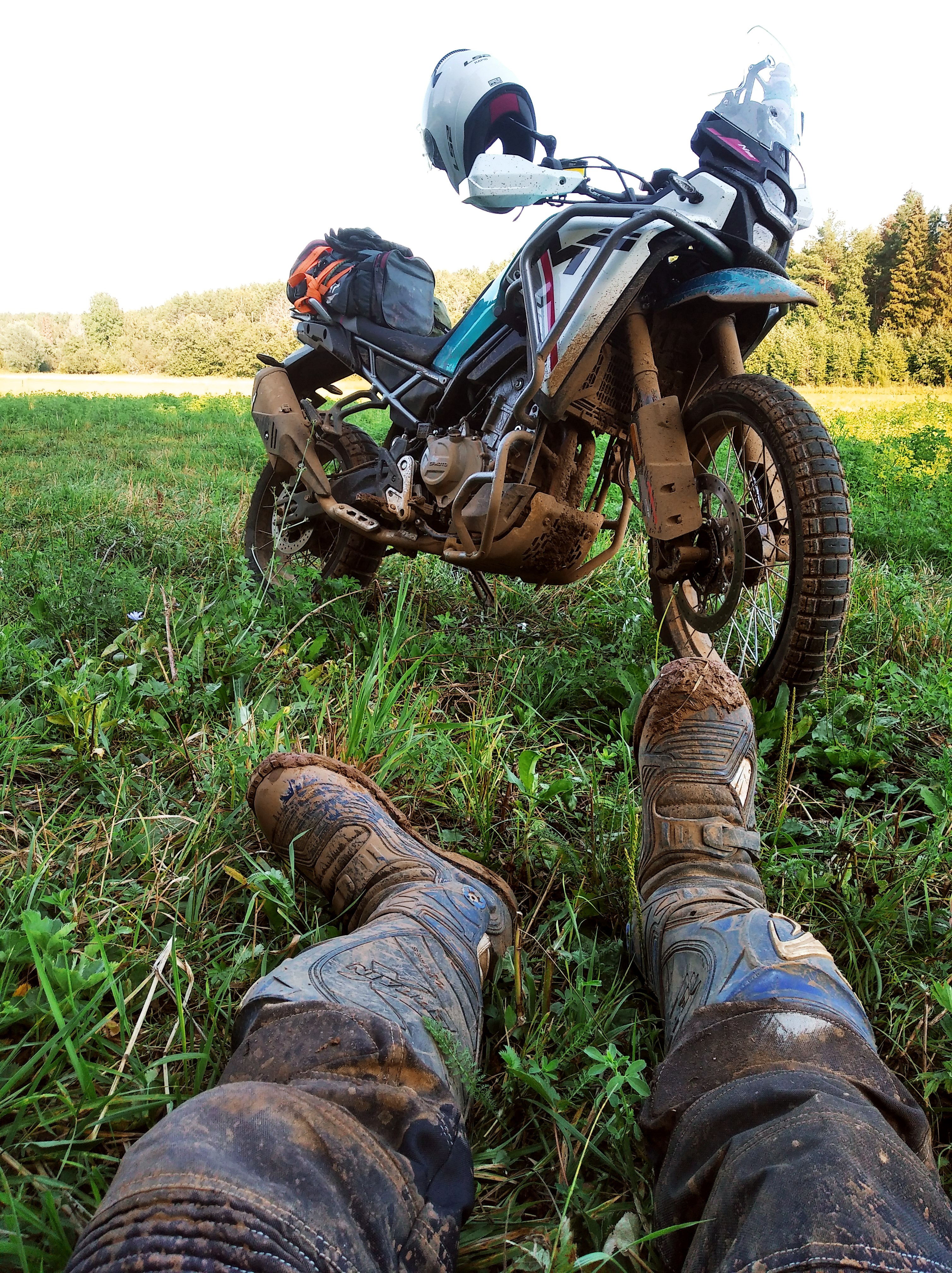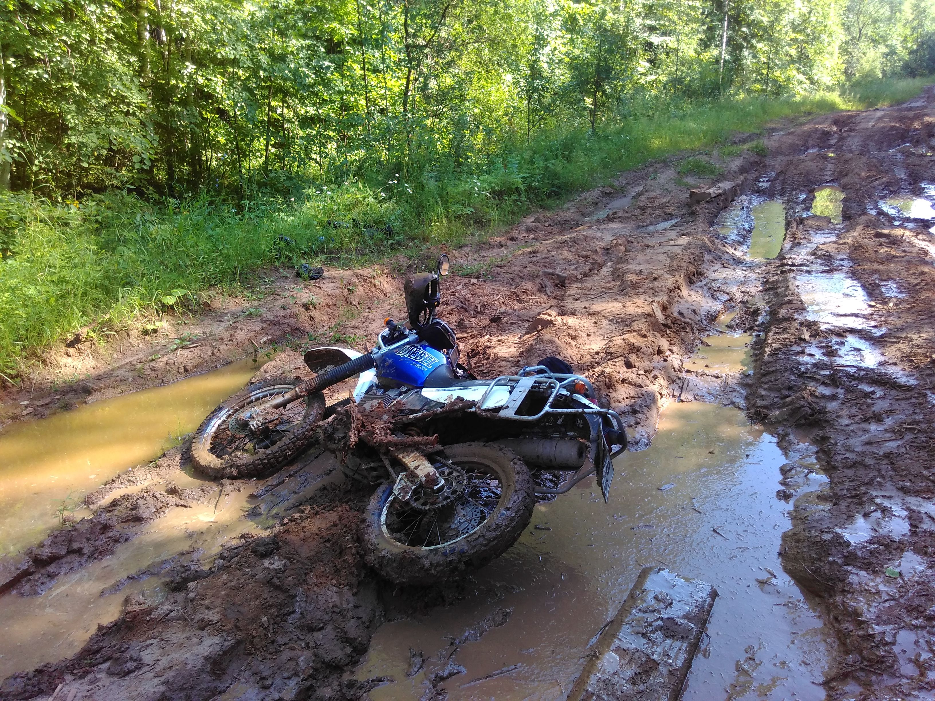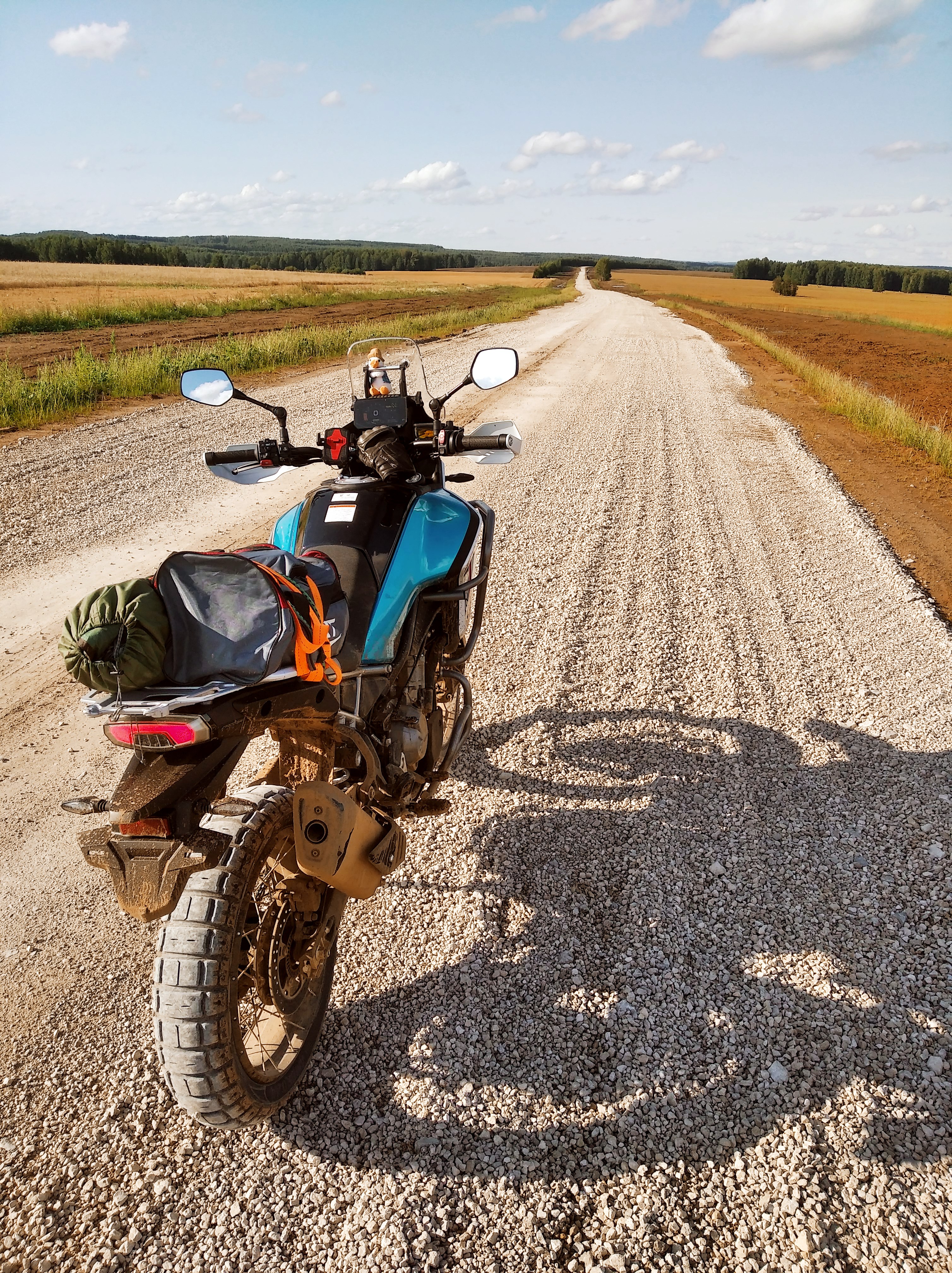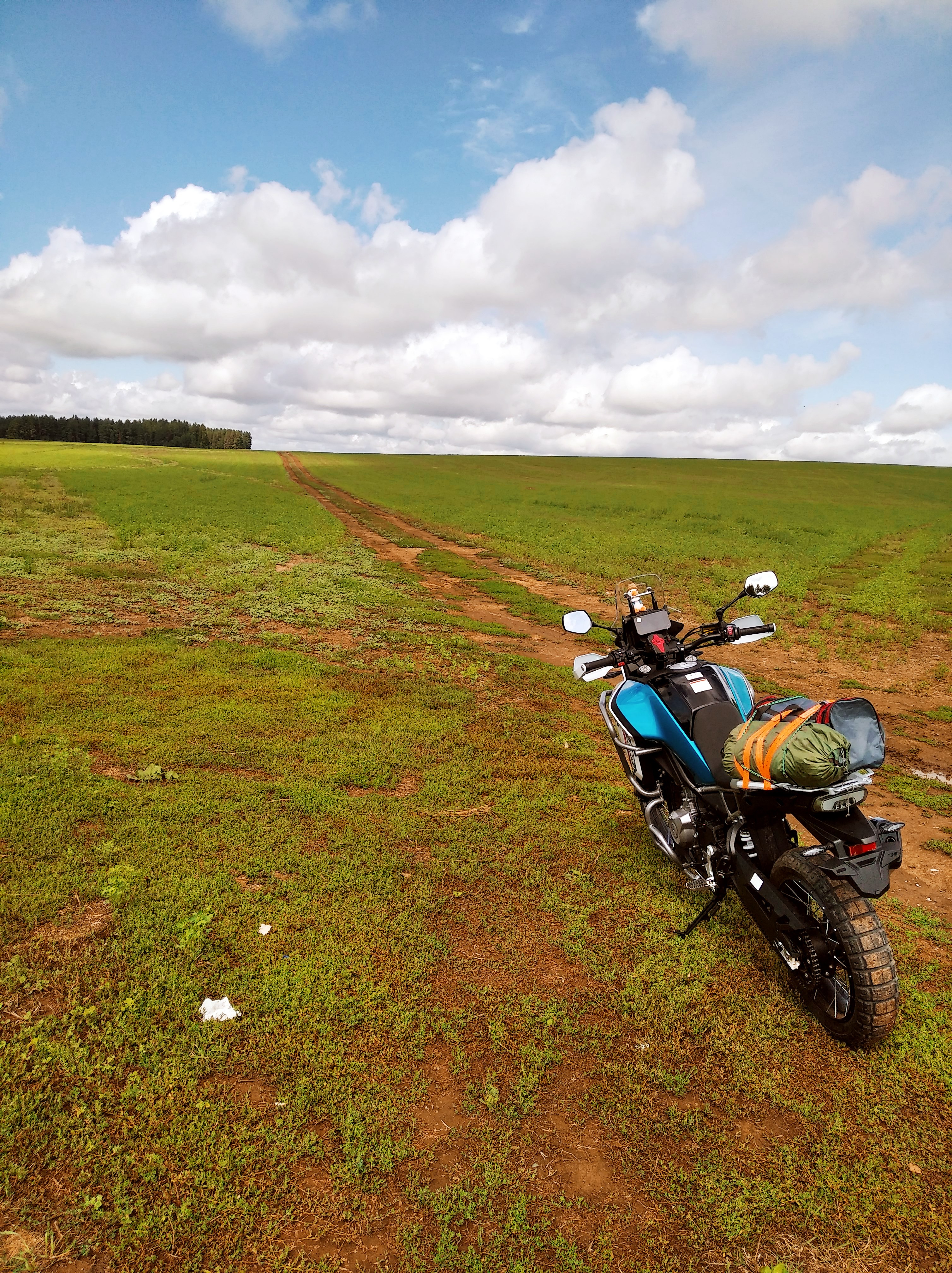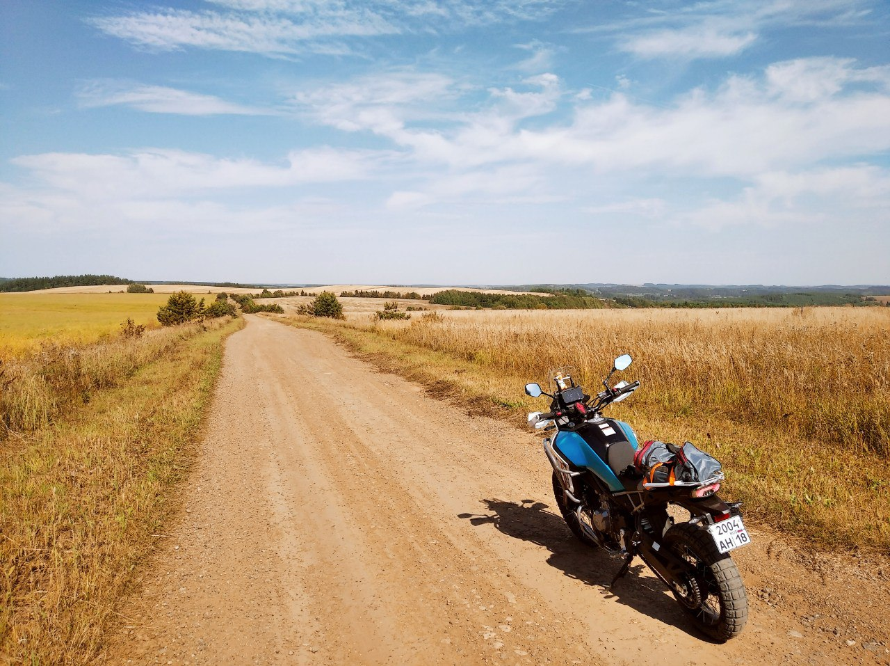 Это получился интересный путь. Оказалось, я приехал в деревню на копание картошки. А я и не знал, хех. Специально проложил маршрут по деревням, ожидая, что будут сухие грунтовки/щебёнки. А они затеяли там ремонт грунтовых дорог, да ещё и дожди прошли накануне, потому оооче разнообразная дорога получилась. Прямо такая, какая случается в путешествиях: асфальт, грейдер, гравий, грязь, мокрая трава, песок, СТИРАЛЬНАЯ ДОСКА.