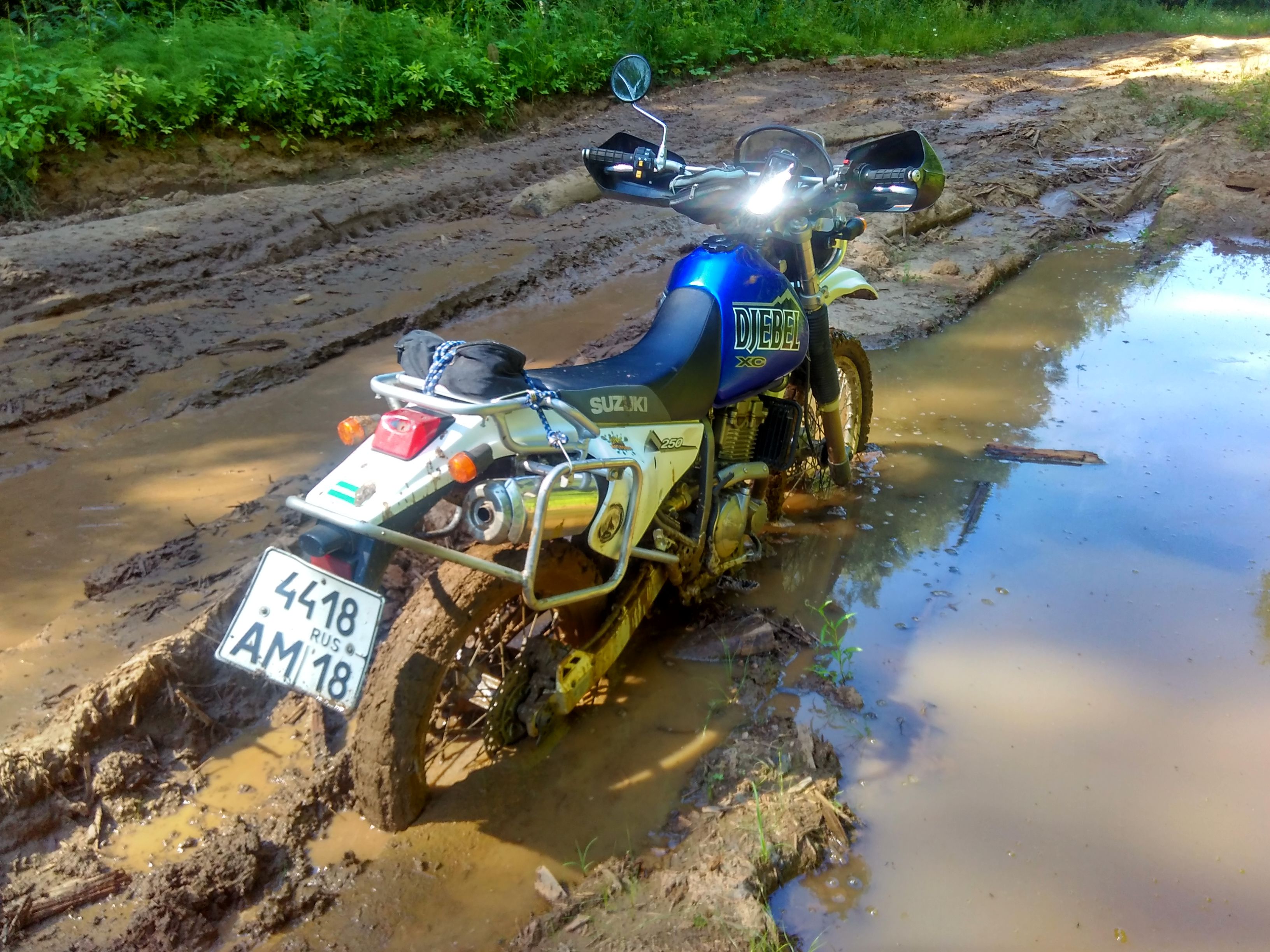 По сухой грунтовке мот идёт вообще здоровско. Хоть ям, хоть не ямы по пути. Мелкие неровности вообще не чувствуешь, когда больше разгонишься, как и торчащий из под засохшей грязи щебень. По рыхлой мелкой гравийке с круглыми гальками тоже идёт офигенно и, что забавно, мот меньше таскает из сороны в сторону, чем Джебель. Видимо сказывается масса.