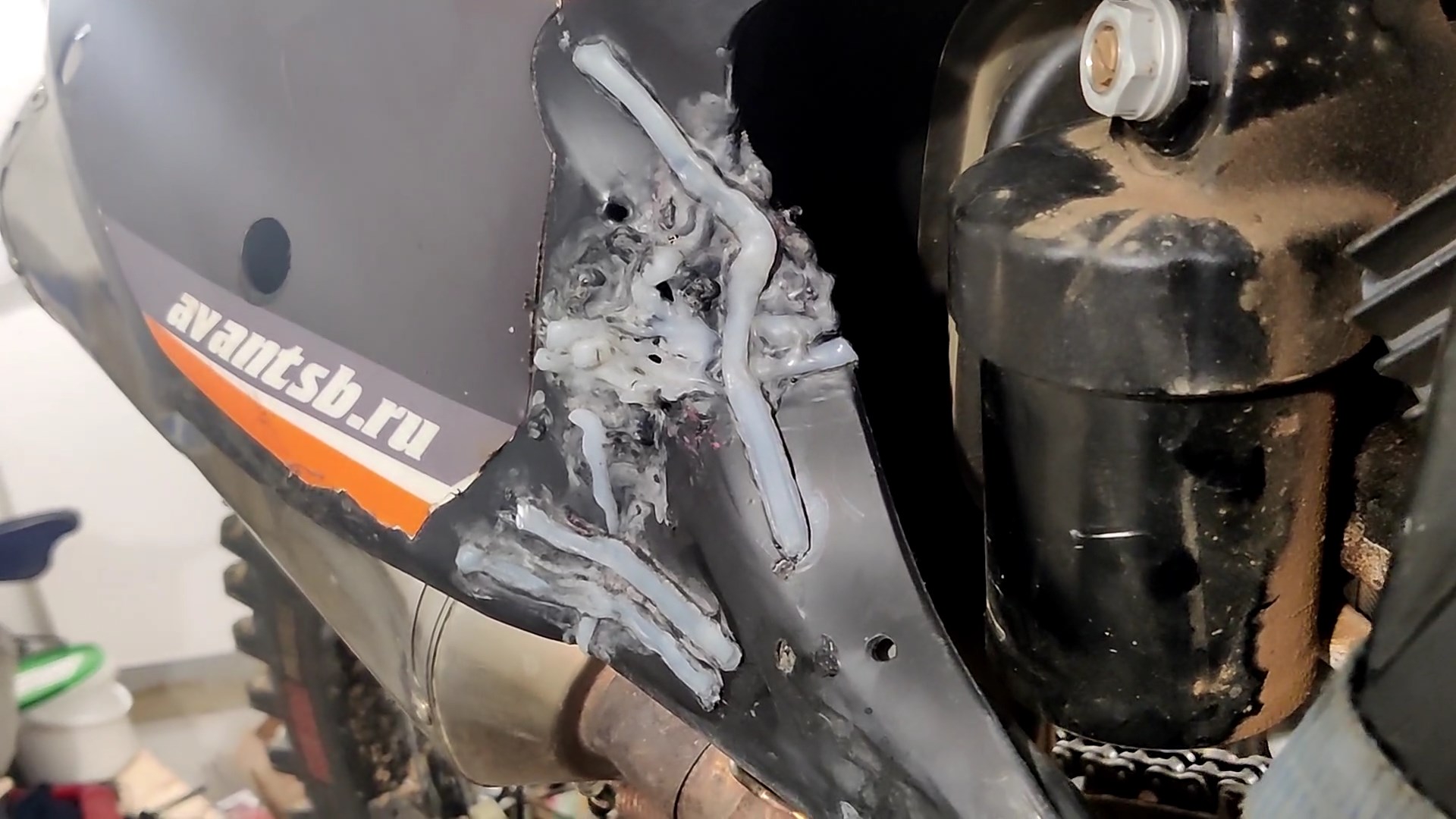 Аа... что-то я сделал с подножкой мота и теперь она в походном положении натирает маятник. А болт её крепящий не затягивается более. Примотал на стяжки к маятнику расплющенную пивную бутылку. Потом подумаю ещё.