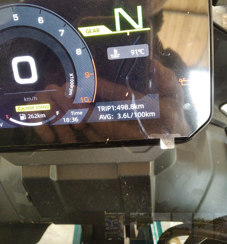 Опять же, расход по приборке 3,5л/100км. По-факту 3,7-3,8. Тоже отлично. Приборка, кстати, тоже офигительная. Цветной дисплей и я боялся, что на солнце нифига не разгляжу, как на телефоне. А вот фиг. При прямом солнце видно отлично. Лучше и быть не может. Ну, и понятно, что показывает всё, что должна: тахометр, спидометр, 2 одометра, средняя скорость и средний расход на КАЖДЫЙ из одометров. Оче удобно. Напряжение аккума, остаток пробега до смены масла, остаток топлива в км, часы.