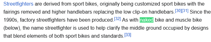 Берешь, например, городской мотоцикл с совершенно прямой и неспортивной посадкой (er6-f). Сдираешь с него пластик. Получаешь городской совершенно неспортивный нейкед (er6-n).