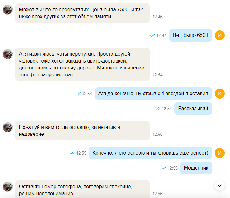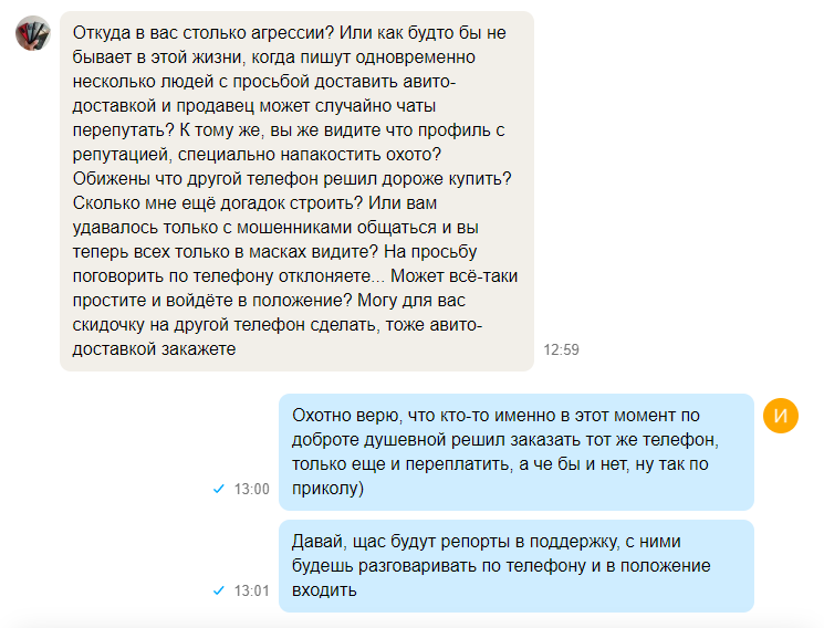 Пиздец авитокрысе щас пишу, редми 10с за 6500 4/128. Обсудили, доставка есть - "берите щас сразу на почту иду вам отправлю". Жму заказать - цена 7500. Эта дура то есть в реалтайме пытается гоев объебывать или что? А еще "40 положительных отзывов на авито, отвечаю за каждый свой телефон". Ну ща будет тебе 1 звезда, хуесосина