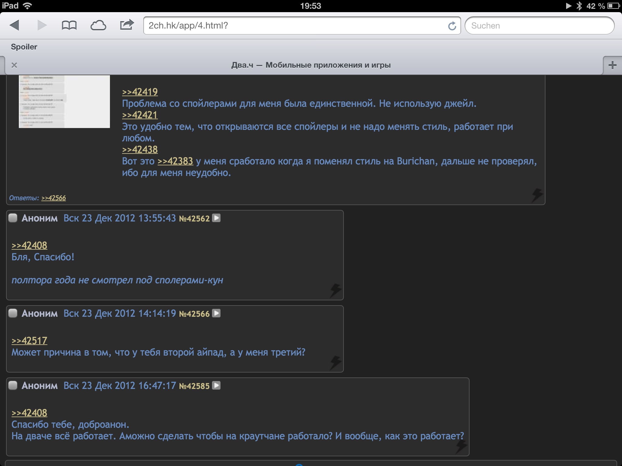 Суп, анон. Купил себе яблочную доску, всем доволен. Сегодня решил подвачевать с него капчу. Подскажите, как открывать спойлеры?
