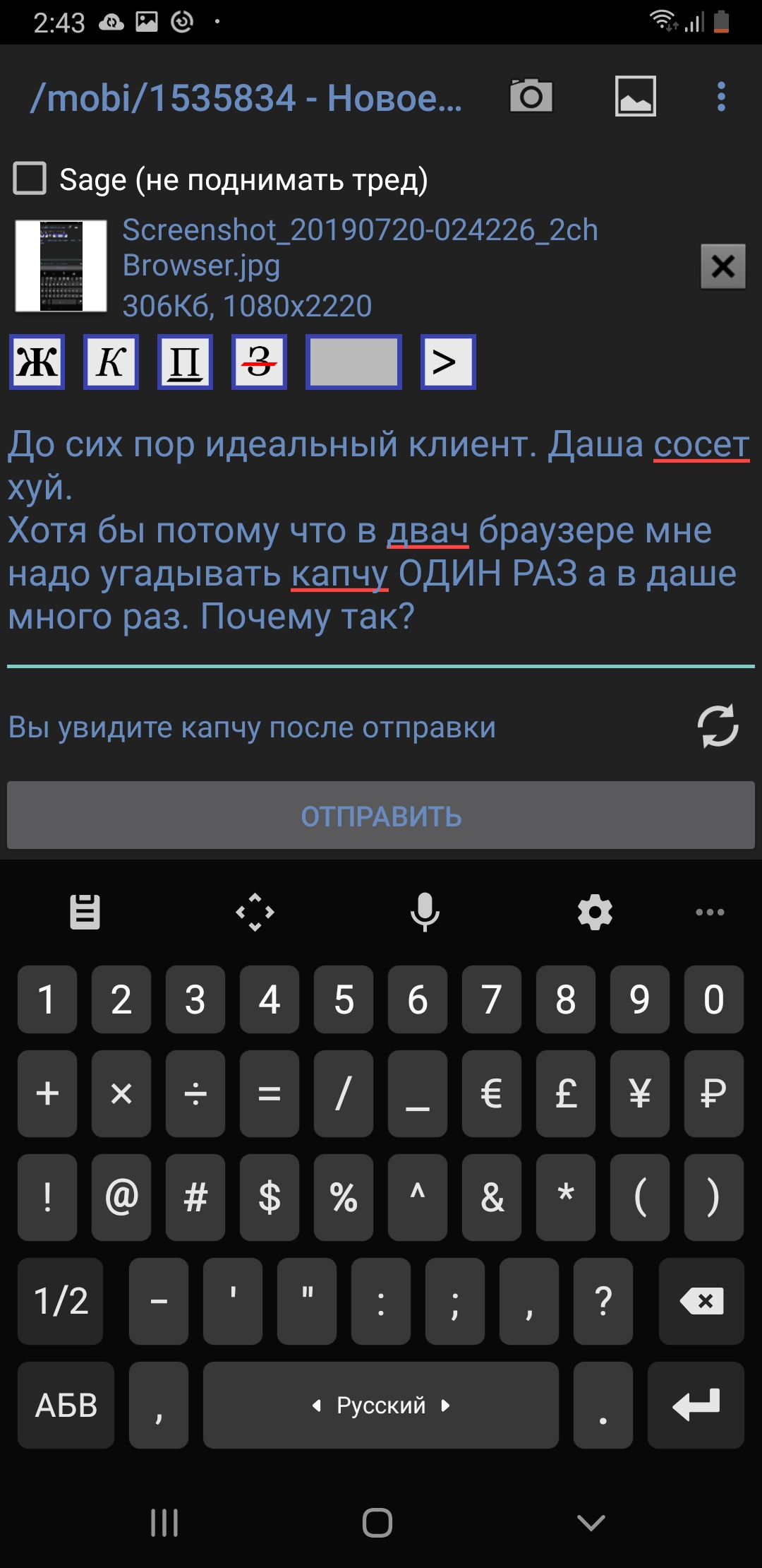 Какой шакал догадался сделать кнопки "Добавить в закладки" и "Сохранить все изображения" рядом? Промахнулся и случайно сохранил 153 изображения из треда. Где их теперь искать? Даже папки указанной по-умолчанию нет на SD. Чини, блять! Нахуя кнопки разметки ПОД формой постинга, да еще и такого шакального размера? Чини блять! Что с капчей? Чини блять! Нахуя ты устроил эту автоматическую залупу с отправкой почты? Сложно было сделать отдельный пункт/форму в настройках для жалоб и багтрекинга? Чини блять! Какого хера реклама появилась? Чини блять! Анон скажет что я бомбанул - да, так и есть. Но я не ожидал такого топора вместо клиента для двоща.